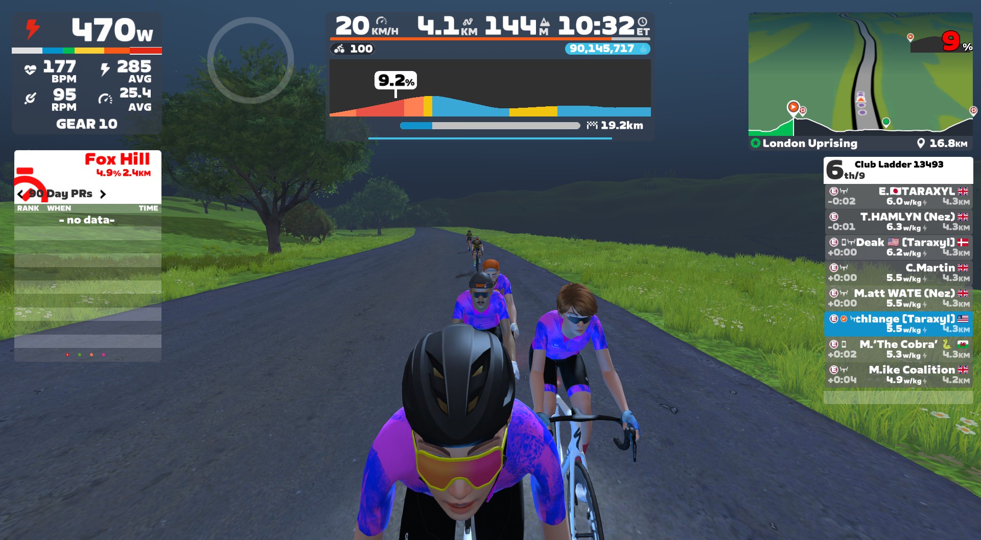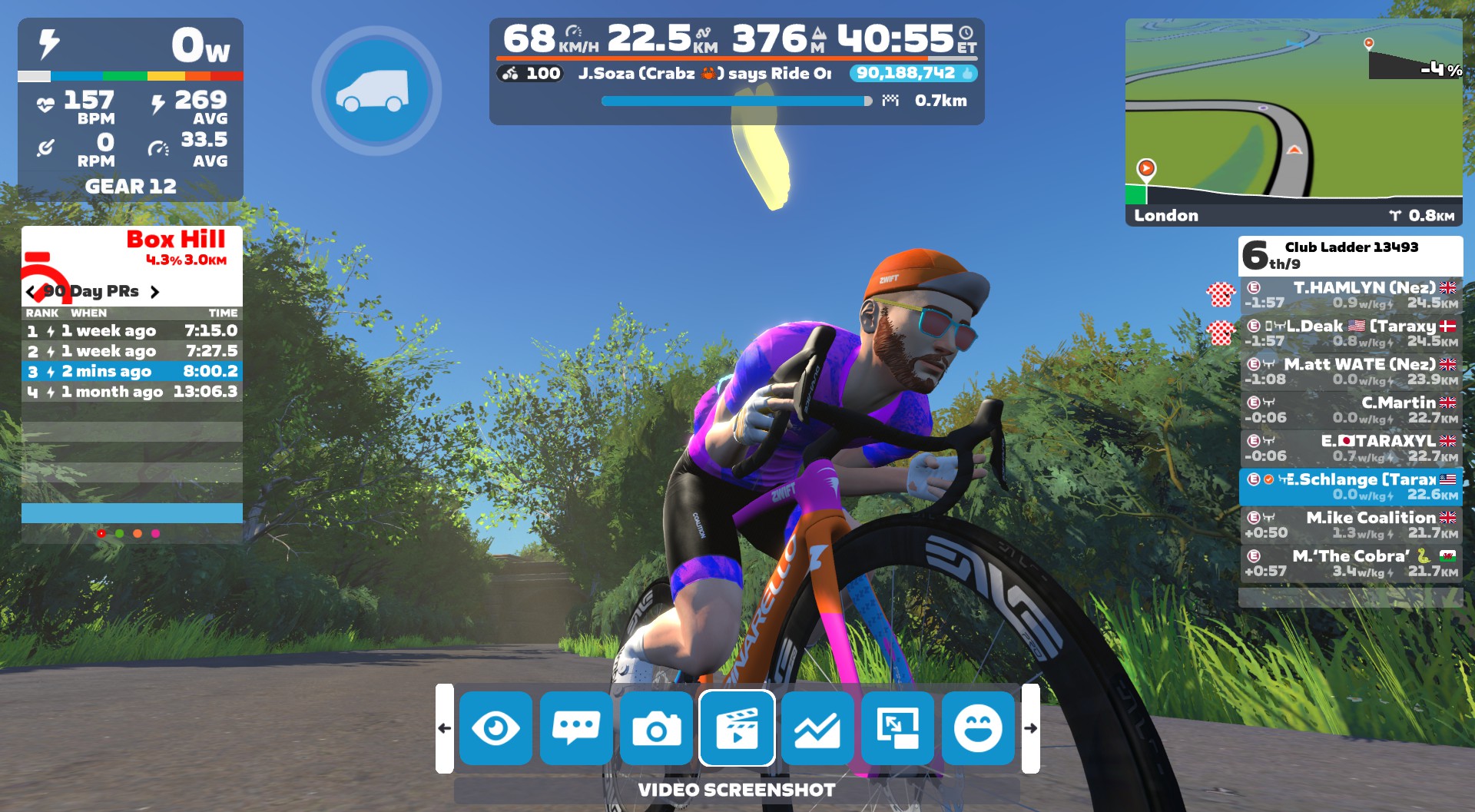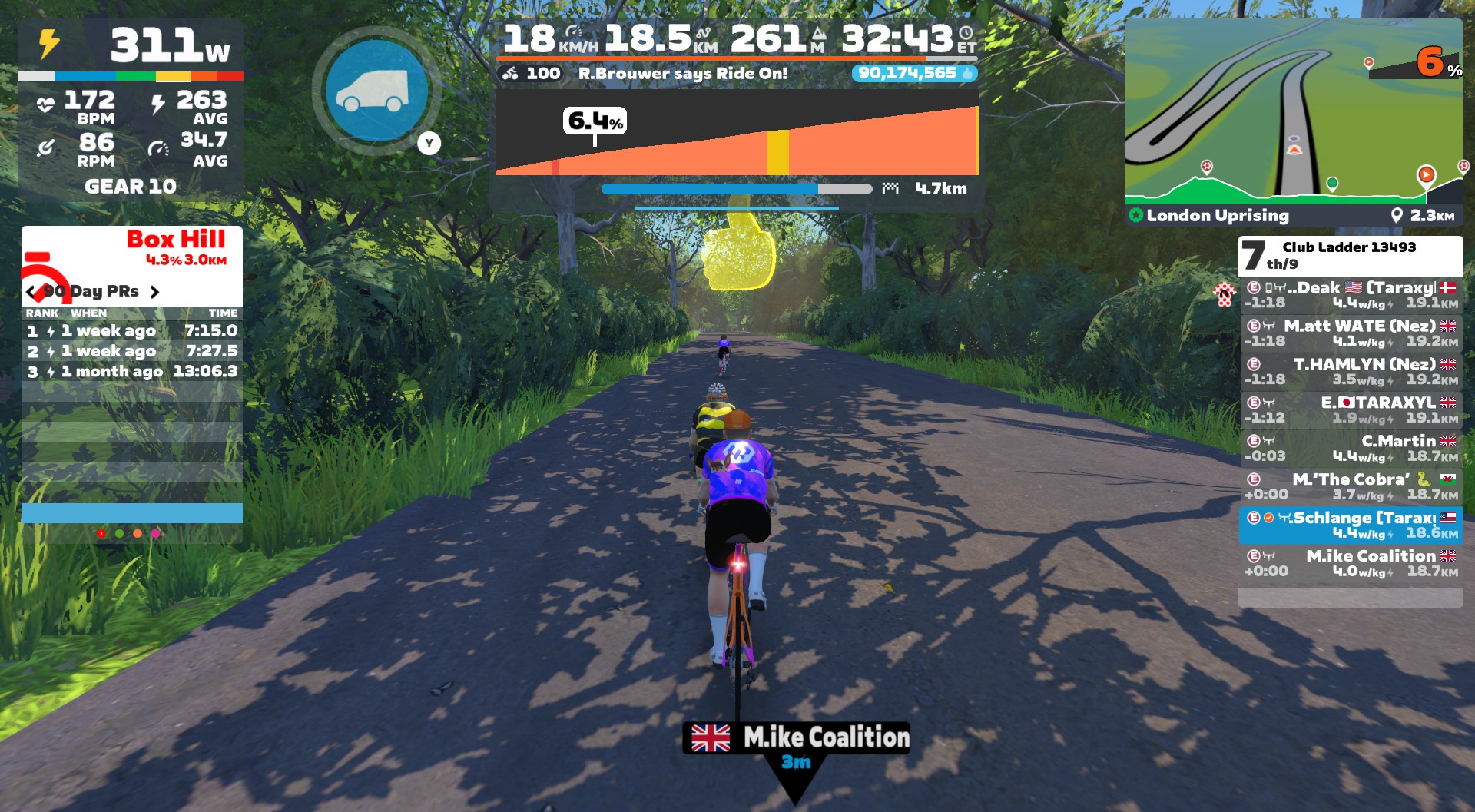 My group started the Box Hill KOM together, then as we turned right and began the steepest part of the climb, Claire ramped up to 4.5-5 W/kg. Martin was trying to chase, but he was slowly losing her wheel. I was sitting on his wheel, benefiting slightly from his draft while he was forced to work a little extra if he wanted to close the gap to Claire.