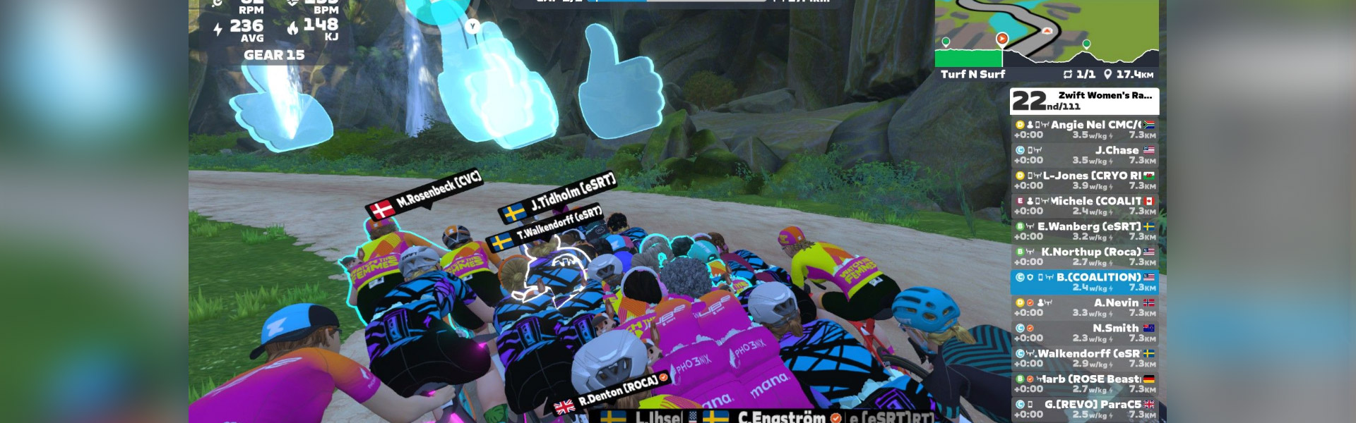 Why shouldn’t esports racing be just as versatile? We already have points races and climbing races. Why not a climbing event organized by weight class? Or a mixed-ability team time trial where the team’s result is based on the finish time of the lowest-ranked member?