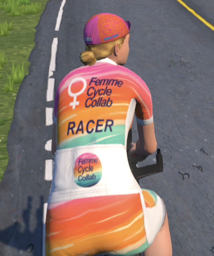 The FemmeCycle Collab created an in-game kit for Zwift that reflects our hopes for the future of the sport.  That jersey is a statement of our belief that women’s racing should be more approachable and more visible.  Identifying a rider as a female racer shows other women on the platform that there ARE women racing, not just the elites, but moms, grandmothers, retirees, and everyone else that doesn’t have the bandwidth or desire to train 12+ hours a week.  Because the more women who race means the more women’s fields will be needed, inside and outside. We hope that increasing the number of women who race will, in turn, drive the demand for more women’s fields, both virtually and in real-world events.