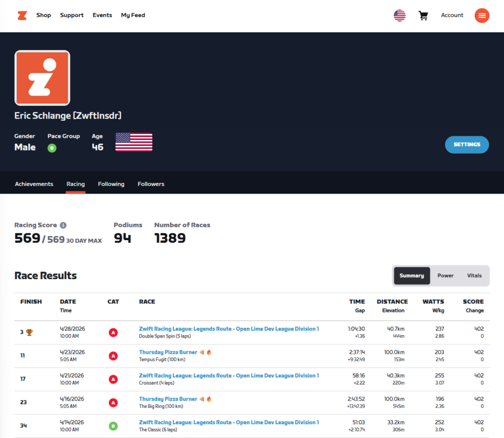 Zwift is launching a new “Racing Profile Page” today at zwift.com. This brings all your Zwift race results together in one place, making it easier to track performance, racing score changes, etc: