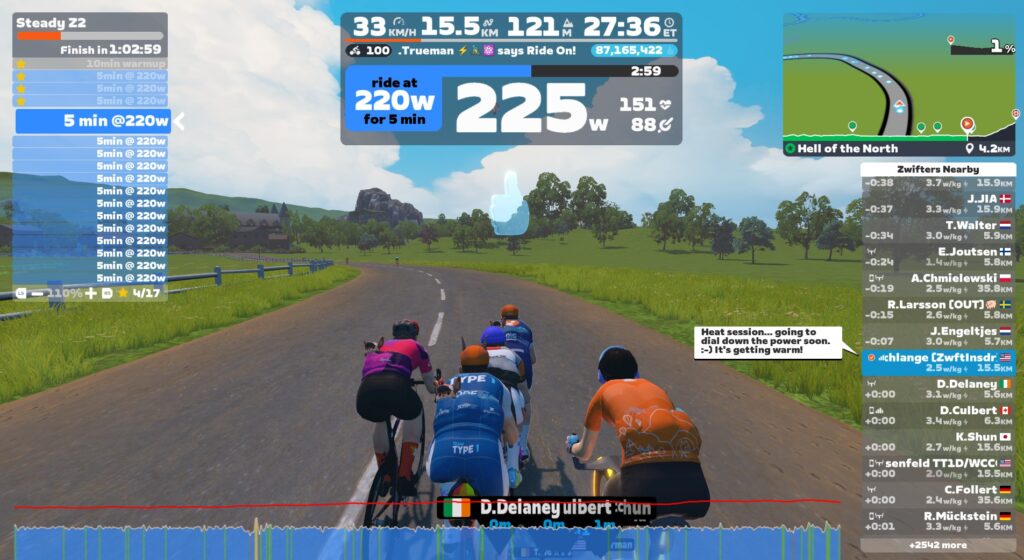 Heat training is particularly compelling because the science behind it is solid, and Zwift provides a well-controlled heat-training environment. It’s really interesting to watch (and feel) in real time as your body reacts to heat stress.