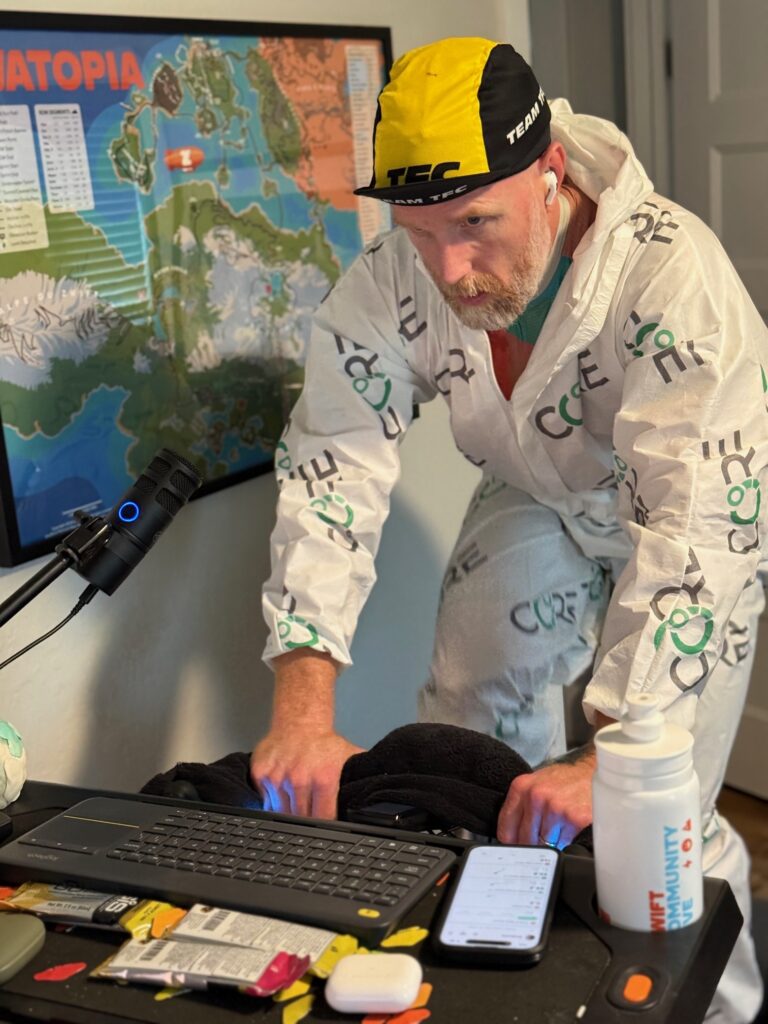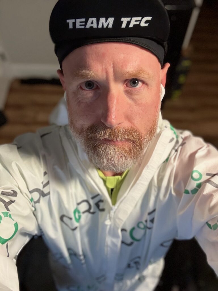 CORE sells a heat training suit, which I’m modeling above. This is what I wore for all my early heat sessions, and I also wore it when I started my big heat training block in December 2025. The suit is nice in that it’s a single article of clothing you can put on over your normal Zwifting kit, and it works, trapping heat and stopping evaporation. The downside of the suit, for me at least, is that it’s not terribly comfortable. The loose fabric can move around and bunch up, the hood can get pulled tight when you sit down after standing up, etc.