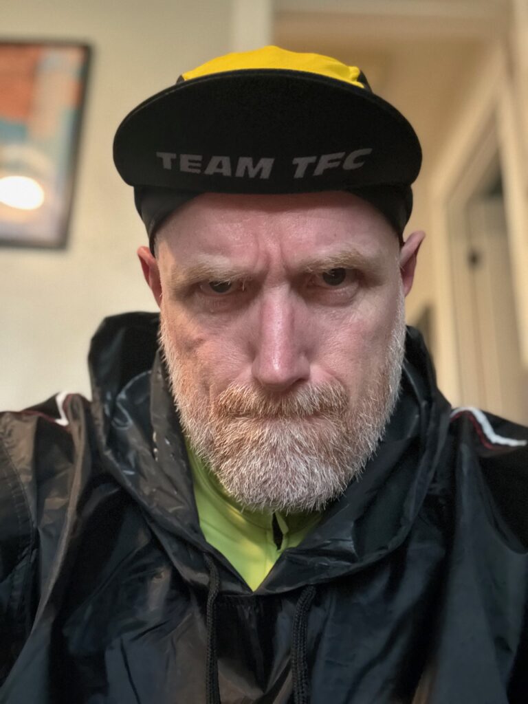 Eventually, I bought a cheap “sauna suit” on Amazon. Best $36 I’ve ever spent! The pants I didn’t need, but I wore thermal bibs I already owned, plus an old cycling jersey, plus the sauna suit jacket, a halo headband, and a casquette on top of the headband. Viola! This was the winning combo. It felt fairly comfortable, while also keeping the heat in.