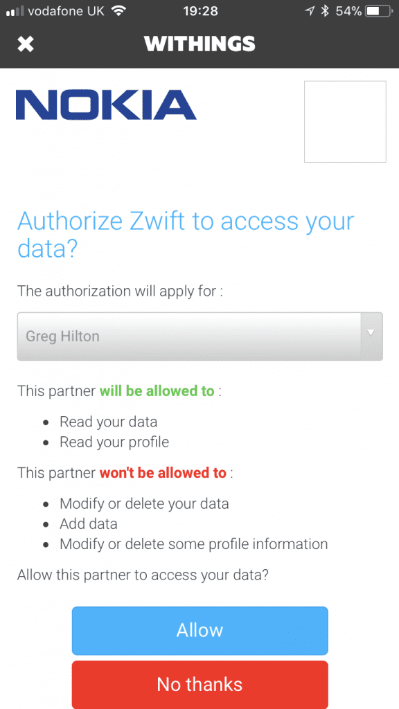 I set up my Withings scales (pick one up on Amazon here). I had to sign into my Withings account and authorise Zwift to access its data:
