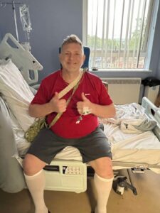 Current side effects of the surgery are lymphoedema in Markโ€™s right arm and breast, nerve damage and pain in his right hand and right thigh, and reduced mobility in his right shoulder along with non-specific pain and discomfort in his right shoulder. Mark is now waiting on the results of more investigations on his shoulder.ย