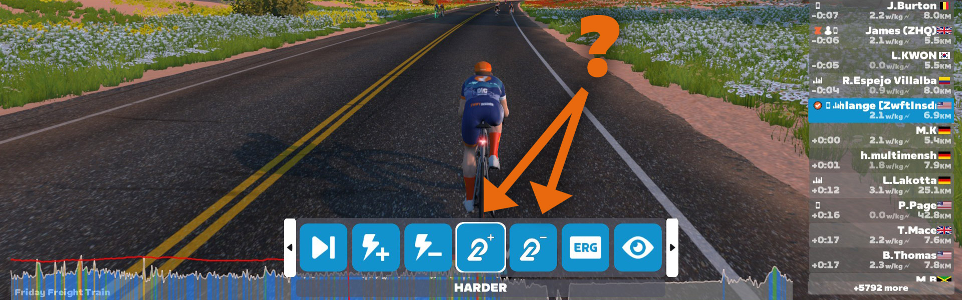 The buttons show a smart trainer with a + or – sign next to it. Mouse over them and the + says “Harder” while the – says “Easier”. Click the + button and your trainer resistance will increase. Click the – button and it will decrease. You’ll even see a little vertical resistance meter moving up and down to the right of the main center HUD element:
