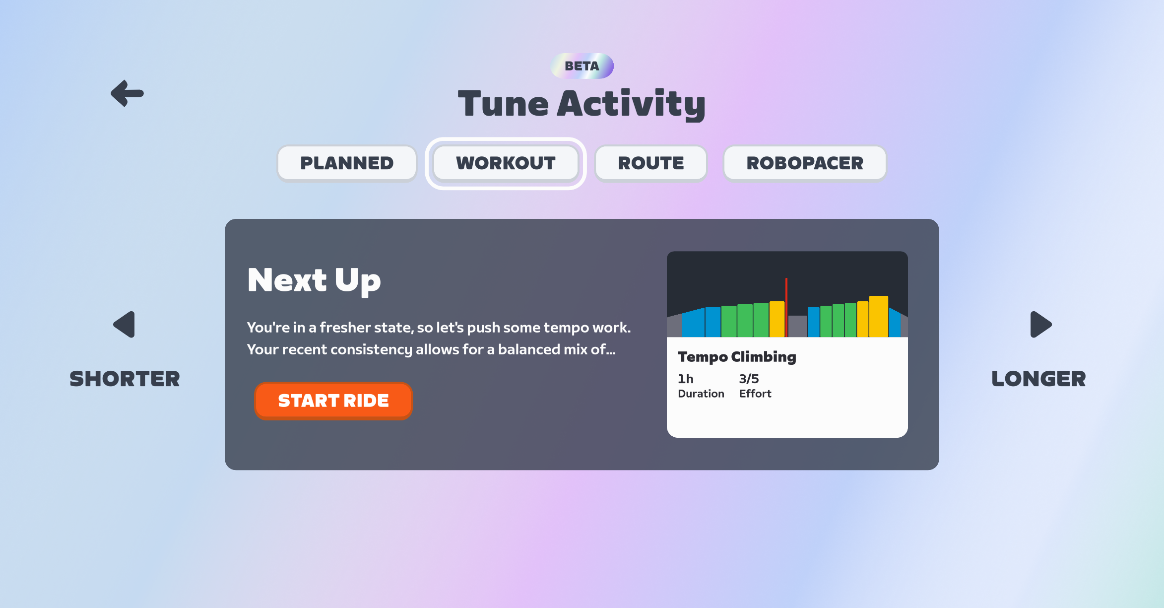 Click “Start Ride” to begin the recommended activity, or “Tune” to see and/or modify the recommendations. Next Up currently serves up four types of recommendations:
