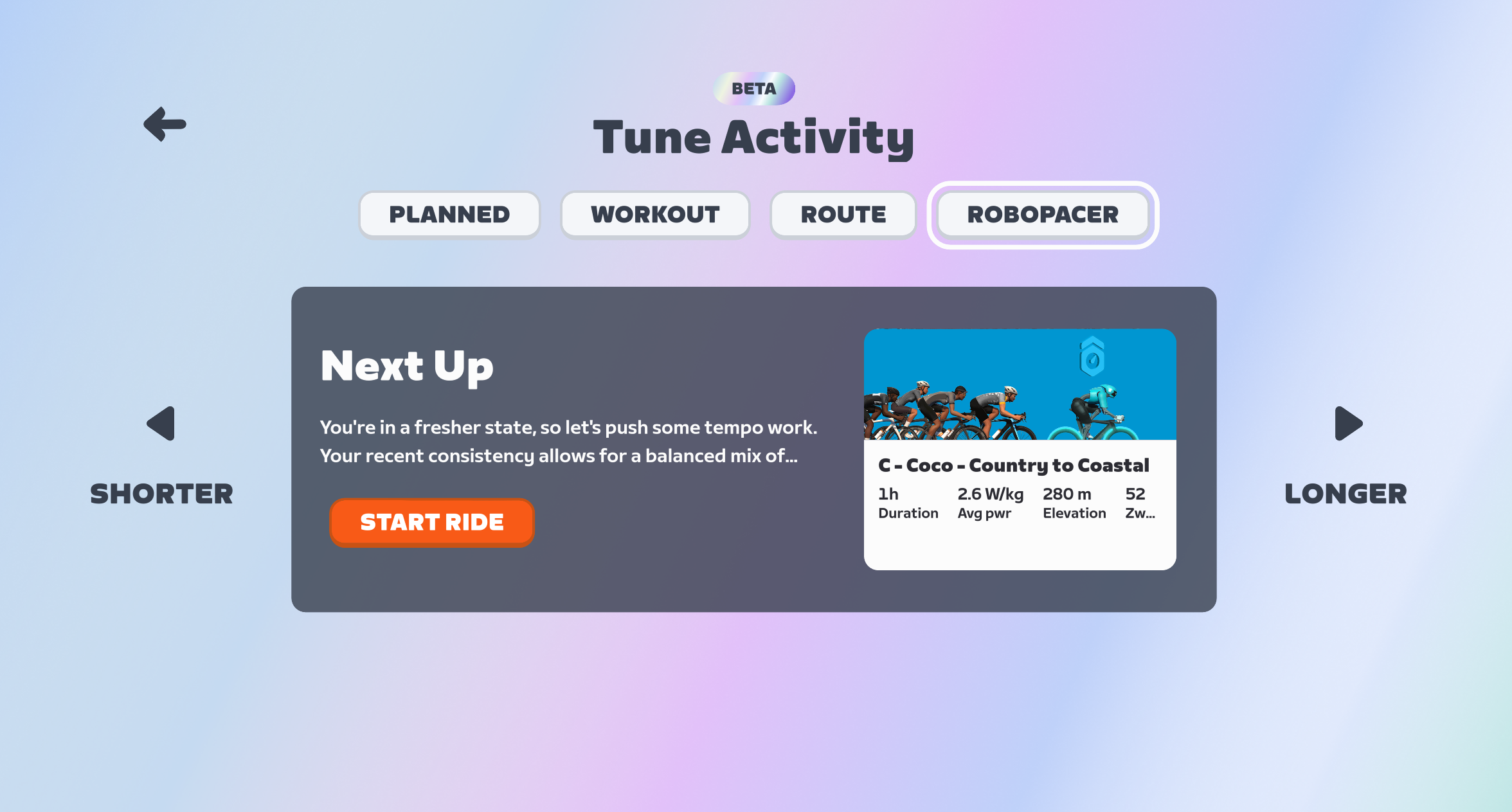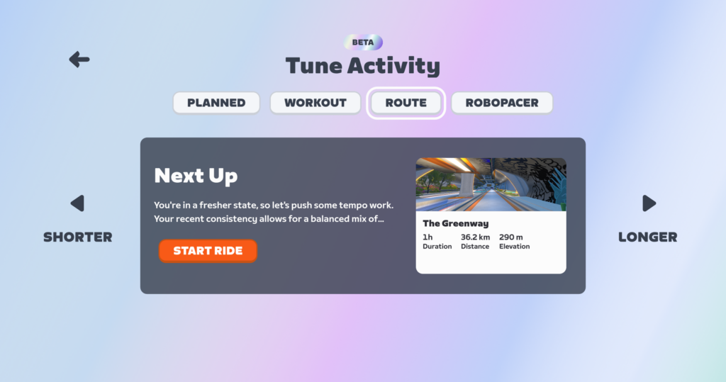 Once you’re on the “Tune” screen, you can click the “Shorter” or “Longer” buttons to select a shorter or longer Workout, Route, or RoboPacer ride. You’re given two shorter options and two longer options, plus the default option, for a total of 5 possible Workouts, 5 Routes, and 5 RoboPacer lengths.