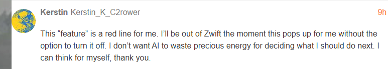 I’m seeing more and more riders asking if the Next Up feature can just be toggled on and off, as they don’t have a use for it. While Zwift has never been big on letting people toggle key features, I think there’s some sense in this idea. Turning it off would save AI processing and free up screen space for the features people do want.