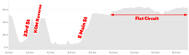The laps begin and end at the Monument Avenue sprint banner, meaning you’ll have a ~12km (7.5 mile) lead-in with 151m (495′) of climbing before your first lap begins. Each flat circuit lap is 5km (3.1 miles) long, so a 1-lap race here will be 12+5=17km long, while a 2-lap race would be 12+5+5=22km long, etc.