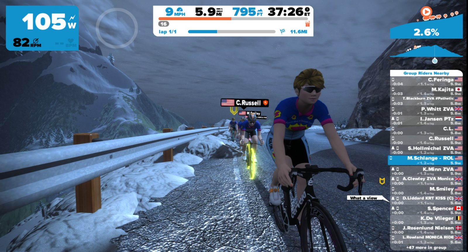 I started riding on Zwift last December. I needed a new way to train myself indoors to improve my fitness for the outdoor season. Riding with people from other countries and having the possibility to meet friends virtually is very motivating. I try to ride almost every day at different intensity levels.