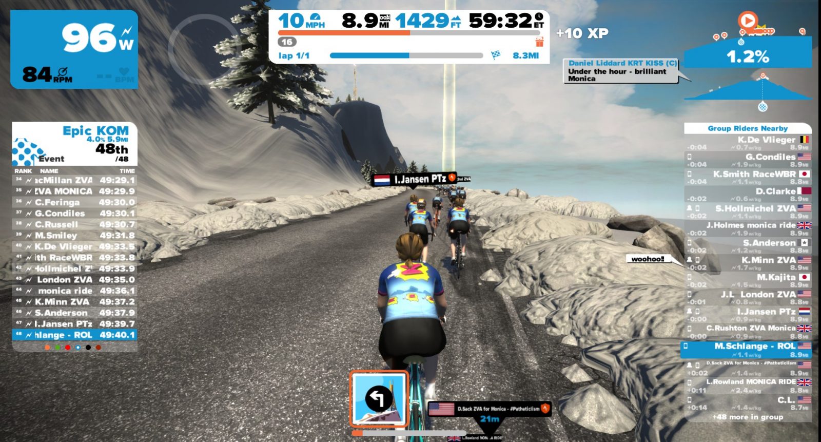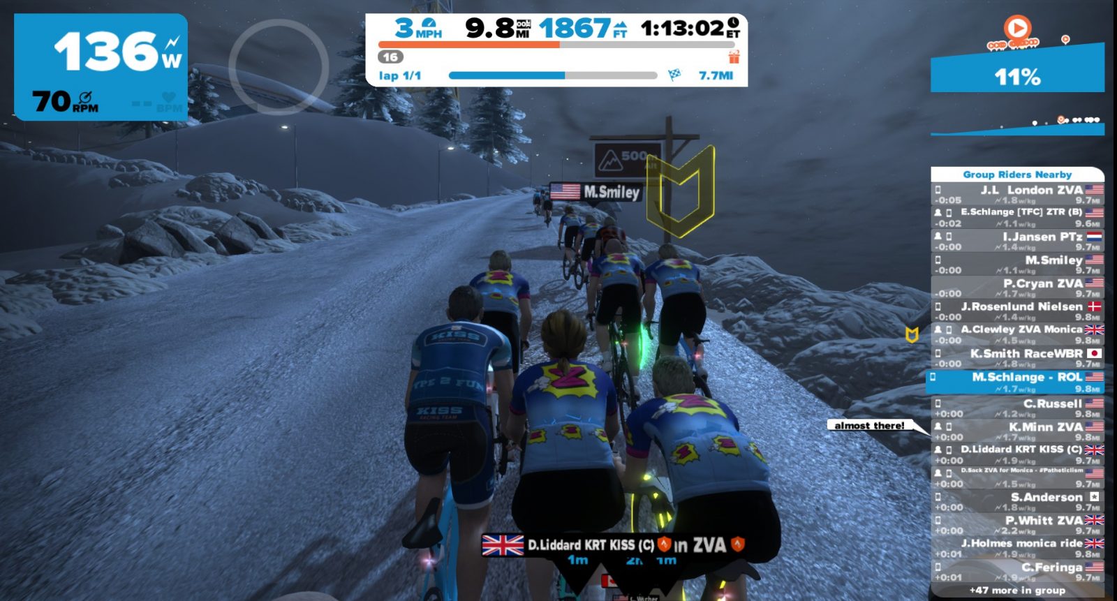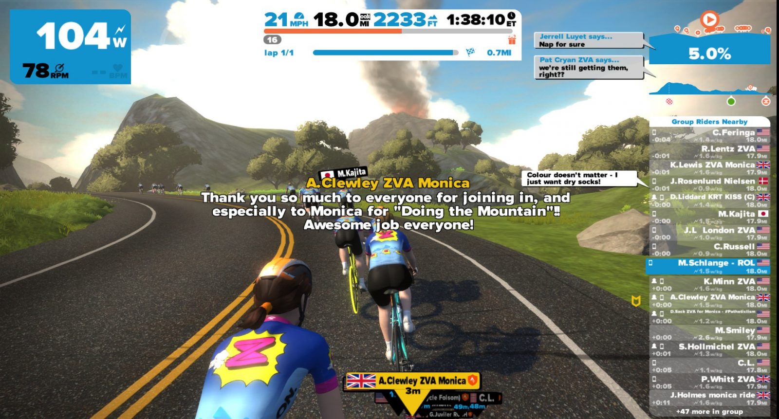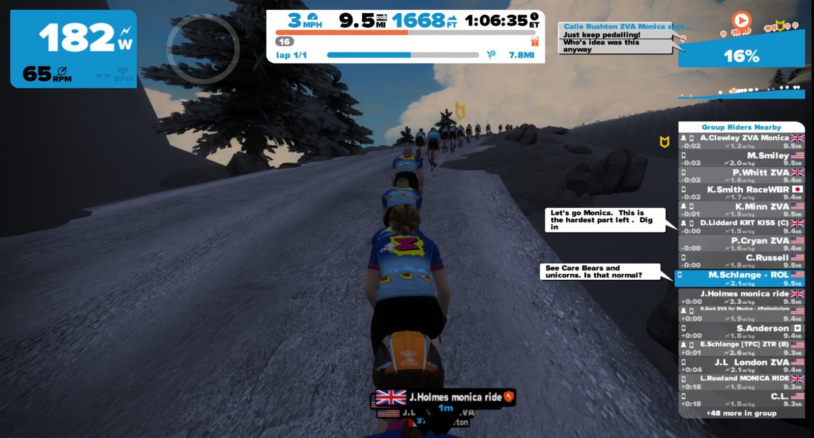 The morning of the ride came fast and early! Up at 5am, ride started at 5:55. I was equally nervous and excited. I was also getting a migraine. My body likes to throw those at me in times of stress. When I logged onto Zwift there were 63 people ready to start the ride with me! As we rode I tried to balance texting messages to those who were writing to me, with talking to a couple of friends on Discord, all while climbing the mountain. That was overwhelming and I couldn’t do it all. So my dear husband, who had planned to ride to the top twice to see how fast he could do it, instead became my domestique. He’d reply to the messages for me as he pedaled alongside. He’d then jump off his bike and run upstairs to get my migraine meds, bring those to me, then pedal hard to join the group again. Everyone really should have a domestique at their house while they ride Zwift!