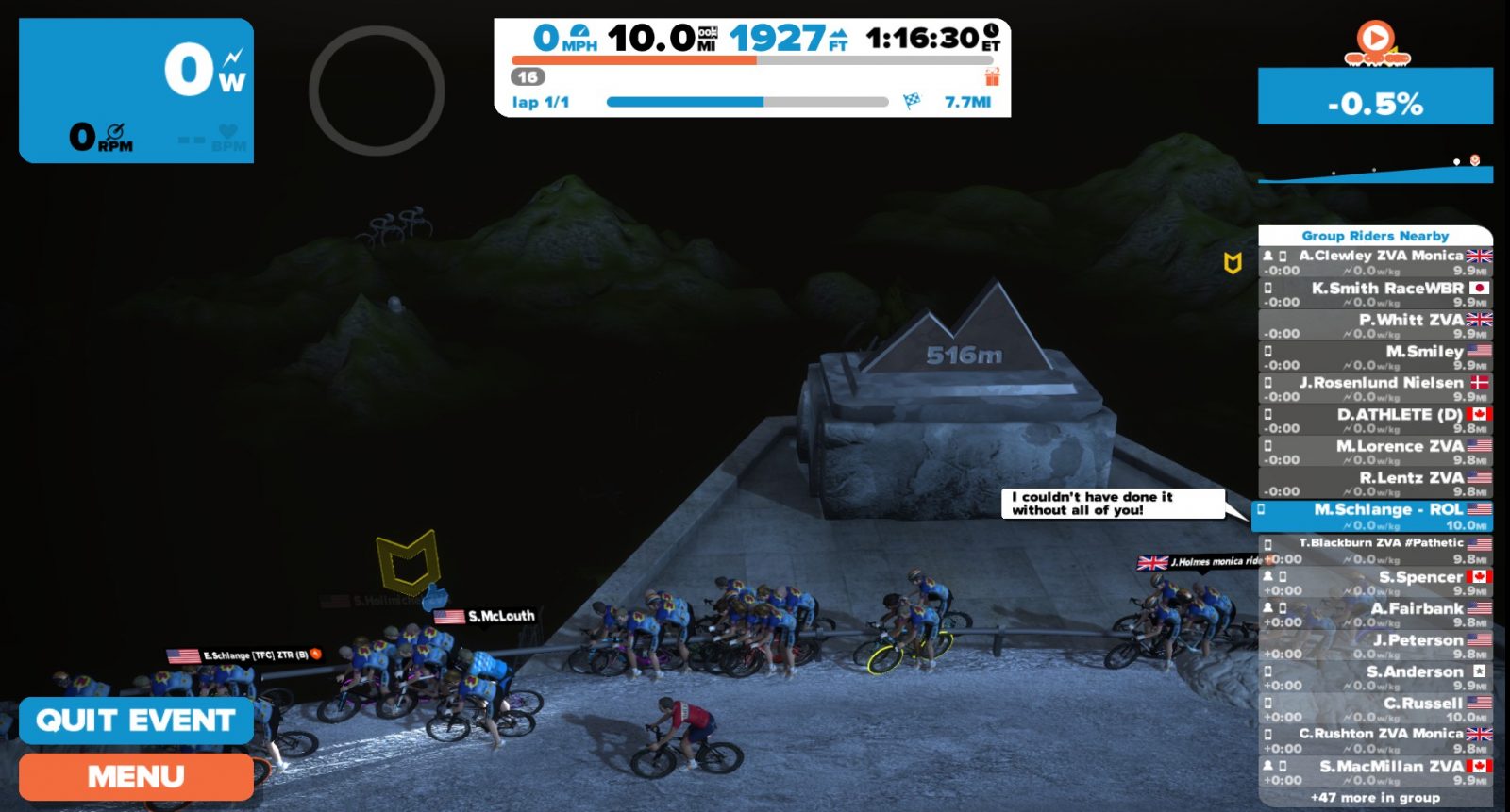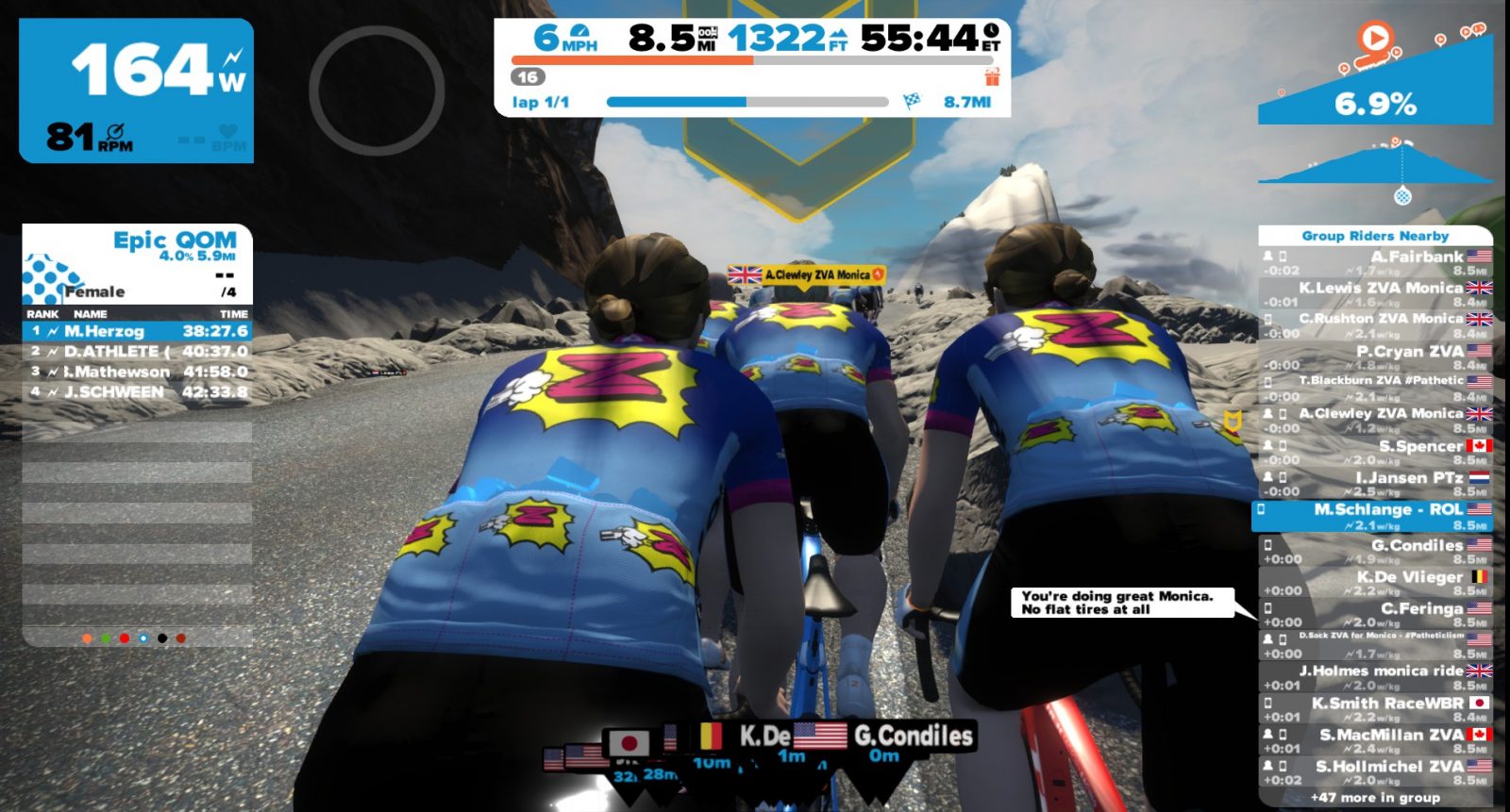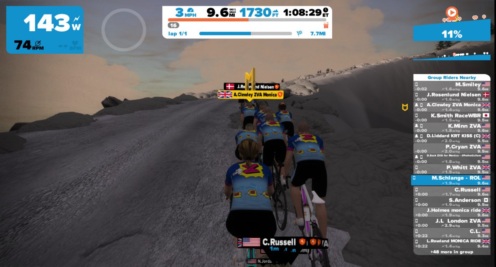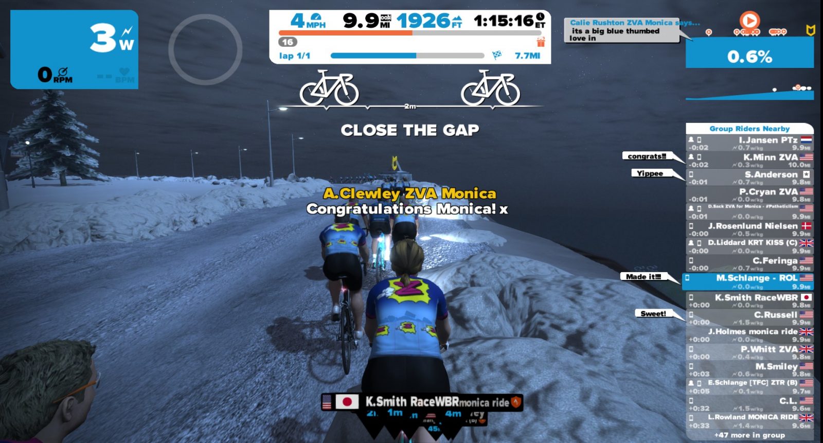 The morning of the ride came fast and early! Up at 5am, ride started at 5:55. I was equally nervous and excited. I was also getting a migraine. My body likes to throw those at me in times of stress. When I logged onto Zwift there were 63 people ready to start the ride with me! As we rode I tried to balance texting messages to those who were writing to me, with talking to a couple of friends on Discord, all while climbing the mountain. That was overwhelming and I couldn’t do it all. So my dear husband, who had planned to ride to the top twice to see how fast he could do it, instead became my domestique. He’d reply to the messages for me as he pedaled alongside. He’d then jump off his bike and run upstairs to get my migraine meds, bring those to me, then pedal hard to join the group again. Everyone really should have a domestique at their house while they ride Zwift!