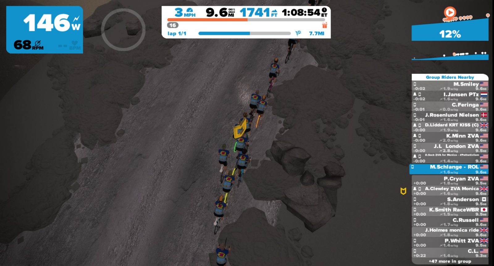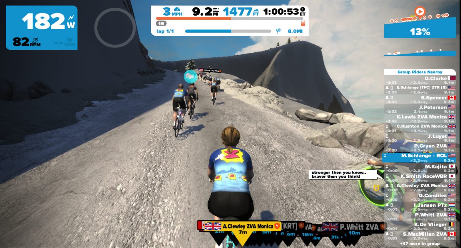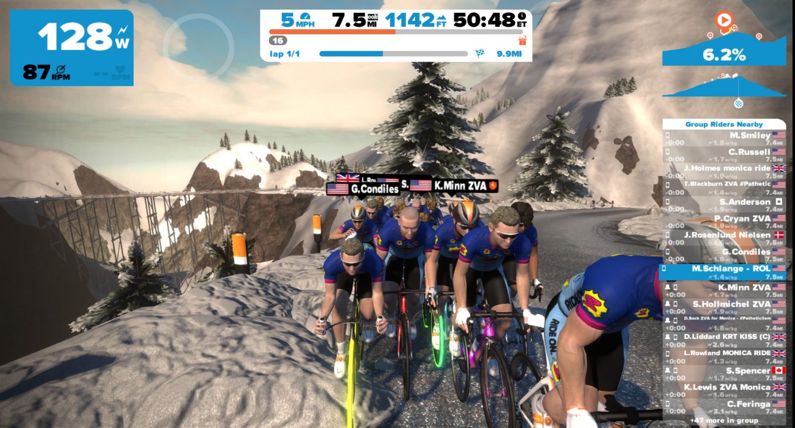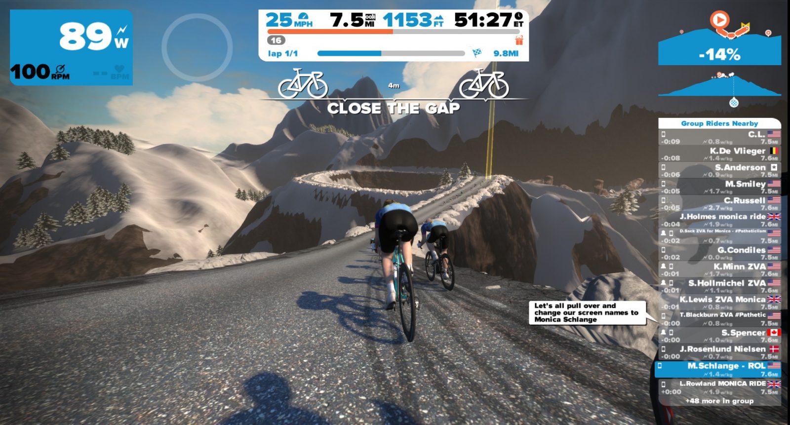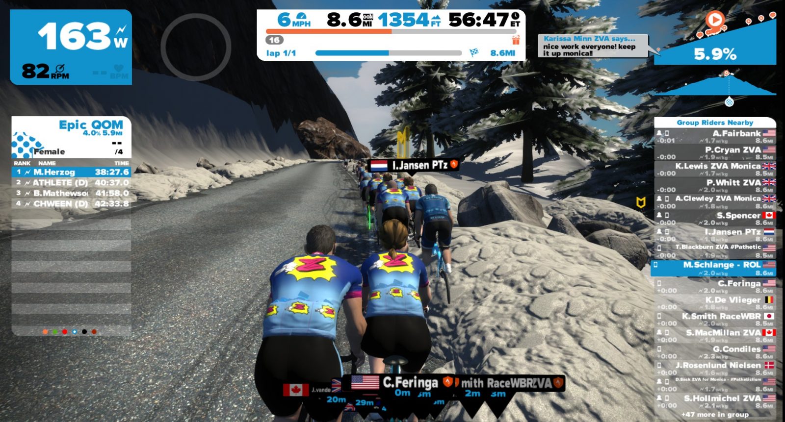 The morning of the ride came fast and early! Up at 5am, ride started at 5:55. I was equally nervous and excited. I was also getting a migraine. My body likes to throw those at me in times of stress. When I logged onto Zwift there were 63 people ready to start the ride with me! As we rode I tried to balance texting messages to those who were writing to me, with talking to a couple of friends on Discord, all while climbing the mountain. That was overwhelming and I couldn’t do it all. So my dear husband, who had planned to ride to the top twice to see how fast he could do it, instead became my domestique. He’d reply to the messages for me as he pedaled alongside. He’d then jump off his bike and run upstairs to get my migraine meds, bring those to me, then pedal hard to join the group again. Everyone really should have a domestique at their house while they ride Zwift!