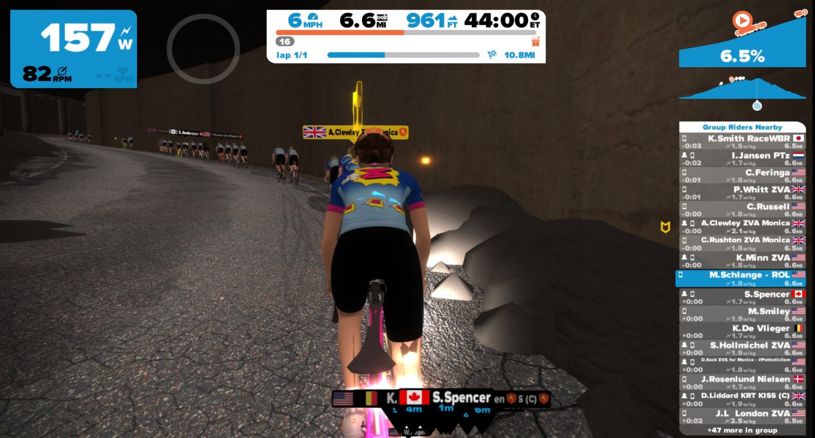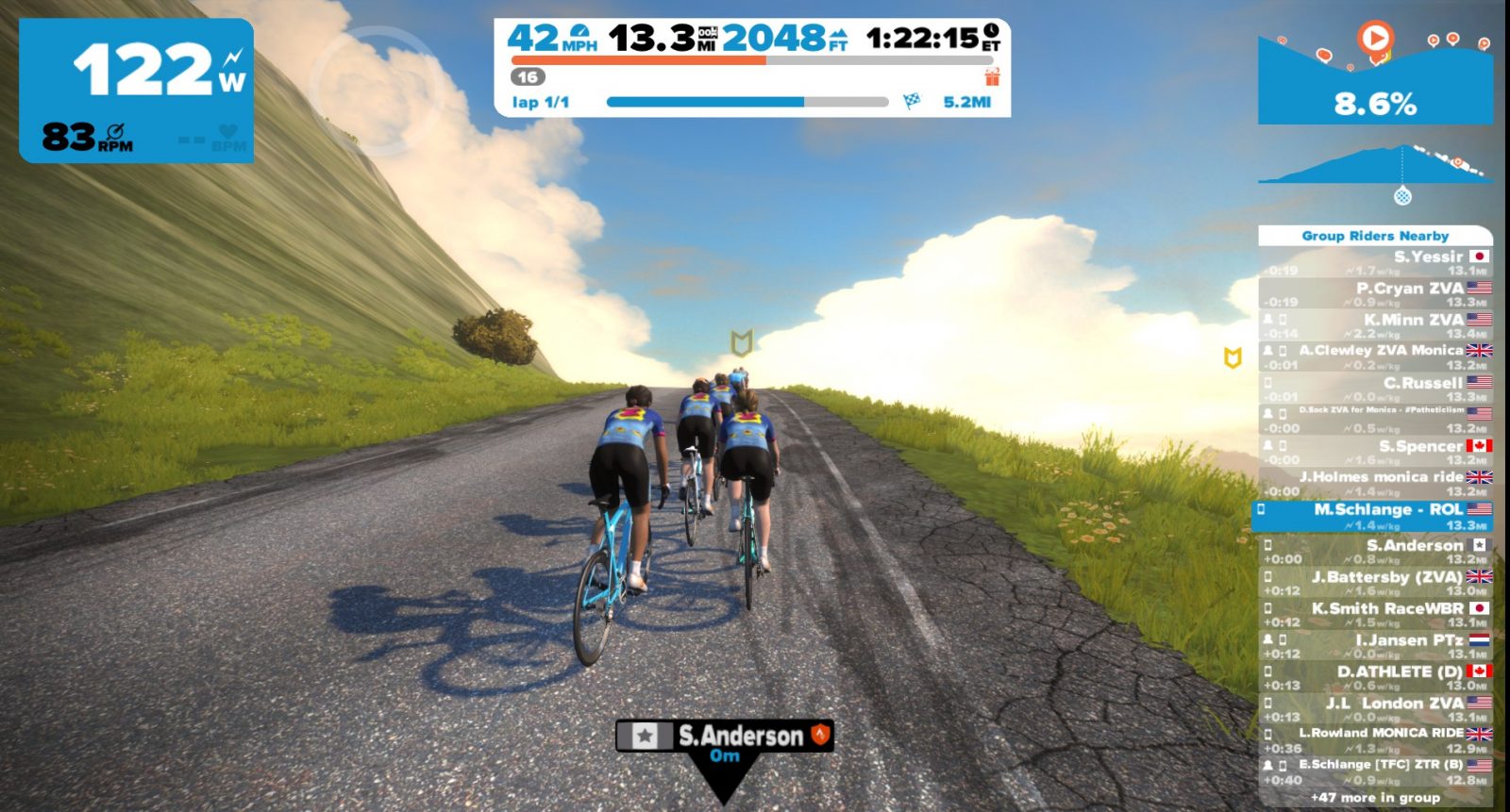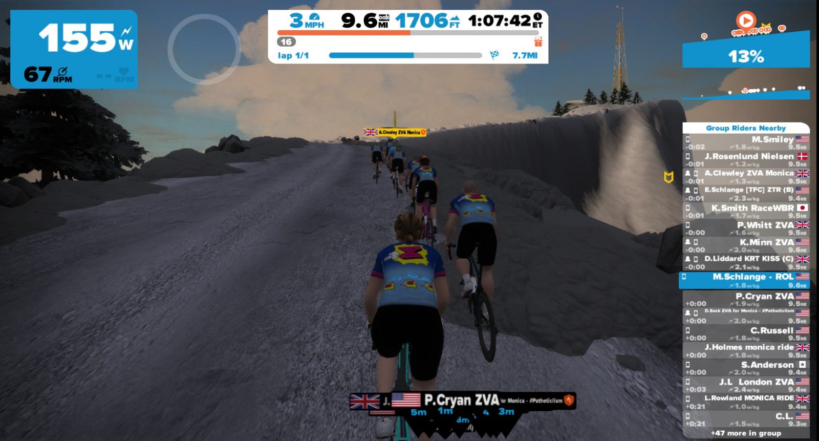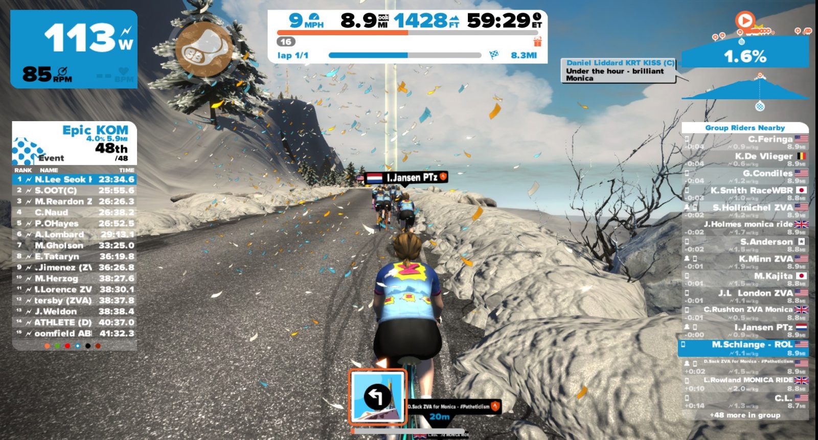 The morning of the ride came fast and early! Up at 5am, ride started at 5:55. I was equally nervous and excited. I was also getting a migraine. My body likes to throw those at me in times of stress. When I logged onto Zwift there were 63 people ready to start the ride with me! As we rode I tried to balance texting messages to those who were writing to me, with talking to a couple of friends on Discord, all while climbing the mountain. That was overwhelming and I couldn’t do it all. So my dear husband, who had planned to ride to the top twice to see how fast he could do it, instead became my domestique. He’d reply to the messages for me as he pedaled alongside. He’d then jump off his bike and run upstairs to get my migraine meds, bring those to me, then pedal hard to join the group again. Everyone really should have a domestique at their house while they ride Zwift!