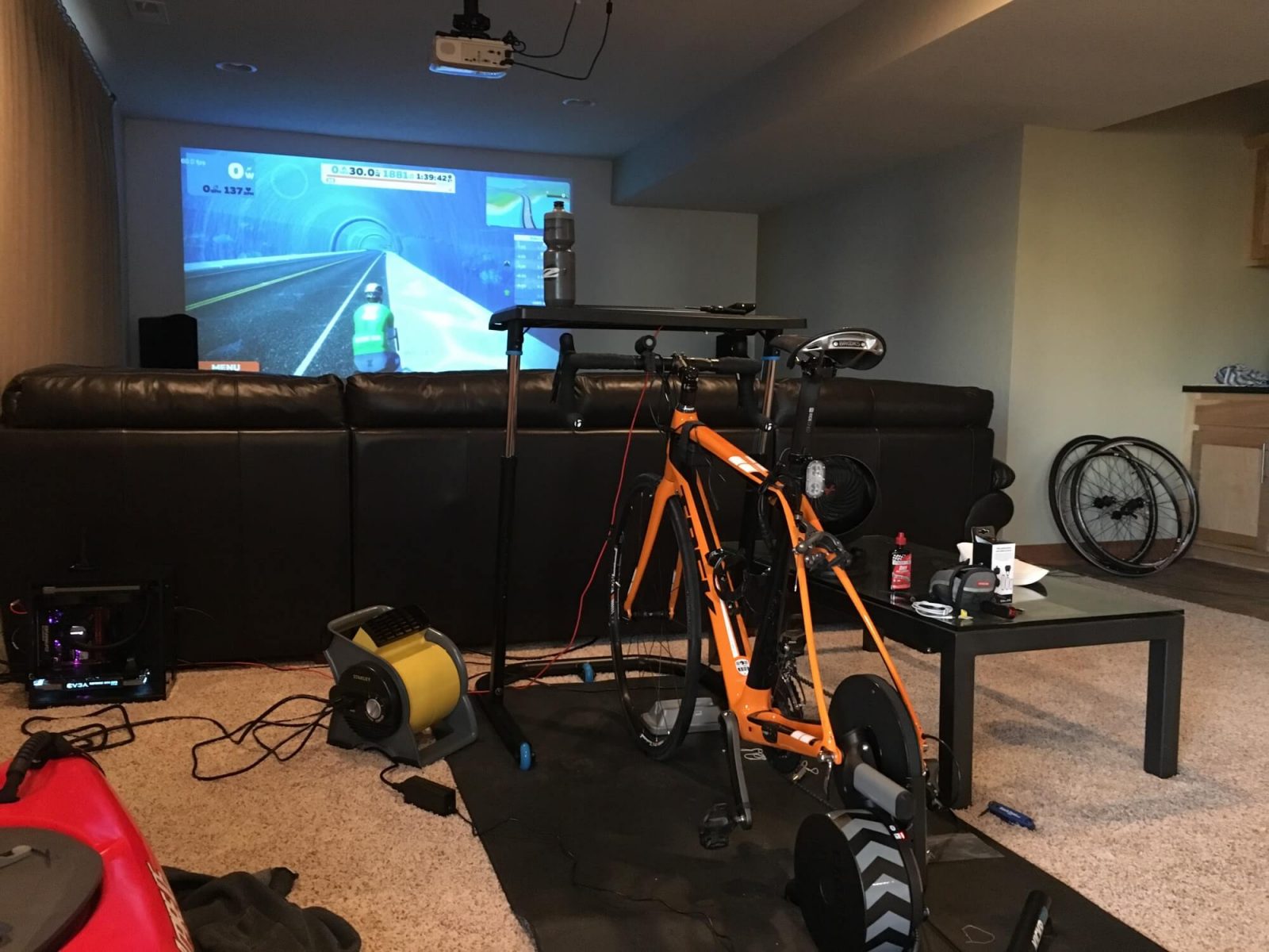 “Our pain cave includes a his and hers setup, so my wife and I can both ride together even in the virtual world. Powered by two custom built computers enabling us to enjoy 4K at ultra detail projected to a 120″ wall for me and a 42” 4K display for my wife. Trainers are Wahoo Kickrs, Wahoo trainer desks, and we both have a massive [amazon_textlink asin=’B000E5S4MW’ text=’Vornado’ template=’ProductLink’ store=’zwif-20′ marketplace=’US’ link_id=’c553a0a0-db78-11e7-abf1-9bf7fe56d78d’] and [amazon_textlink asin=’B006O6FA22′ text=’Stanley fan’ template=’ProductLink’ store=’zwif-20′ marketplace=’US’ link_id=’de5b1936-db78-11e7-97a6-95b62c127ee4′] to keep us cool. Controls and BT sensors through the iPhone app, and Pandora to rock some tunes.”