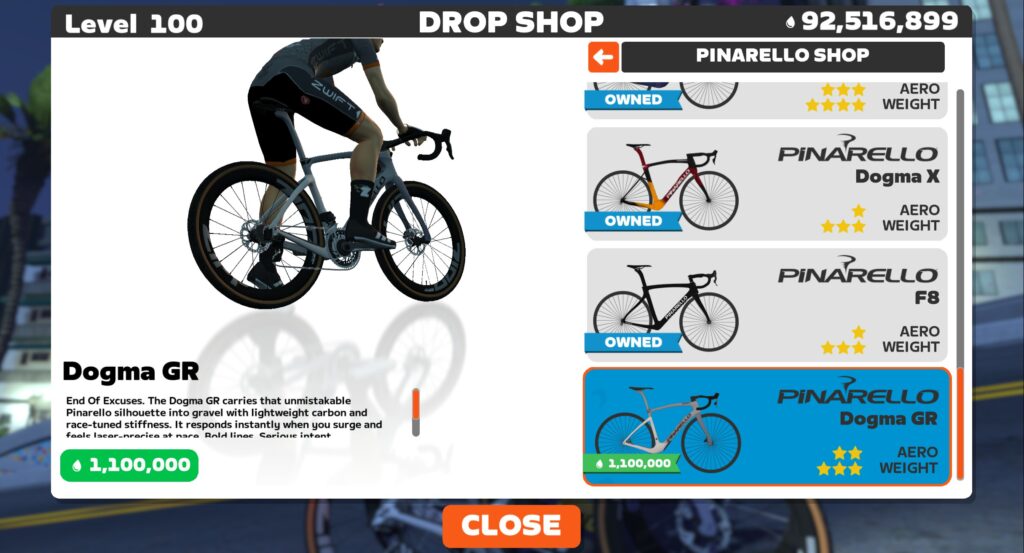 Like all frames in Zwift, Pinarello’s Dogma GR can be upgraded in five stages. As a high-end race bike, each of the five stages results in a performance improvement. The Dogma GR upgrade stages are as follows: