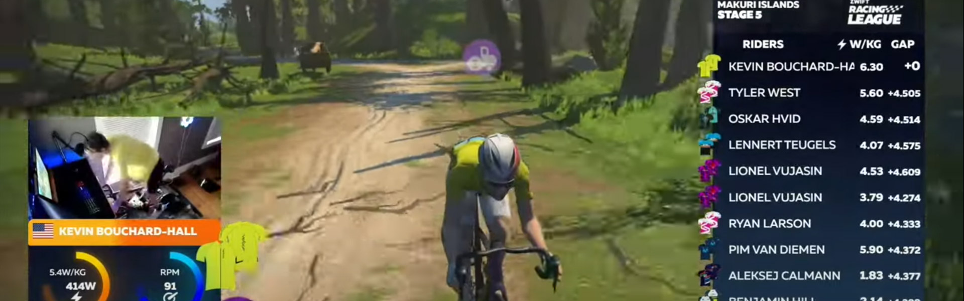 I got a small gap and then Restart’s Jamrozik jumped across. I had to work hard to stick his wheel and watching the leaderboard behind I could see Tuegals was also coming across. This meant one of two things would happen. Either he was going to take us to the promised land, or the pack would panic and bring us back. It ended up being the latter. But Jamrozik was desperate to get me to pull through. He made his avatar flick his elbow. He started waving on his zoom camera. I heard he was even on the Restart Discord yelling for me to pull through! He looked like a wounded chicken riding a bike, flapping a broken wing.