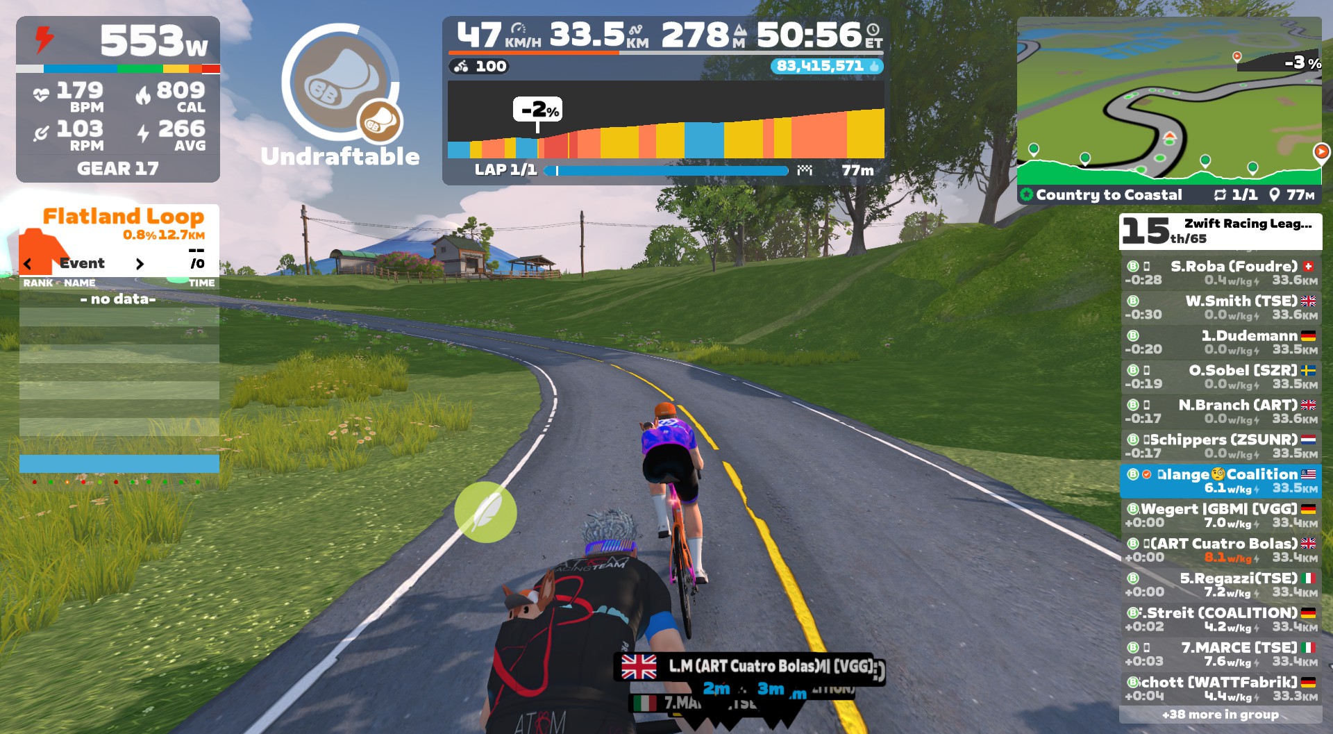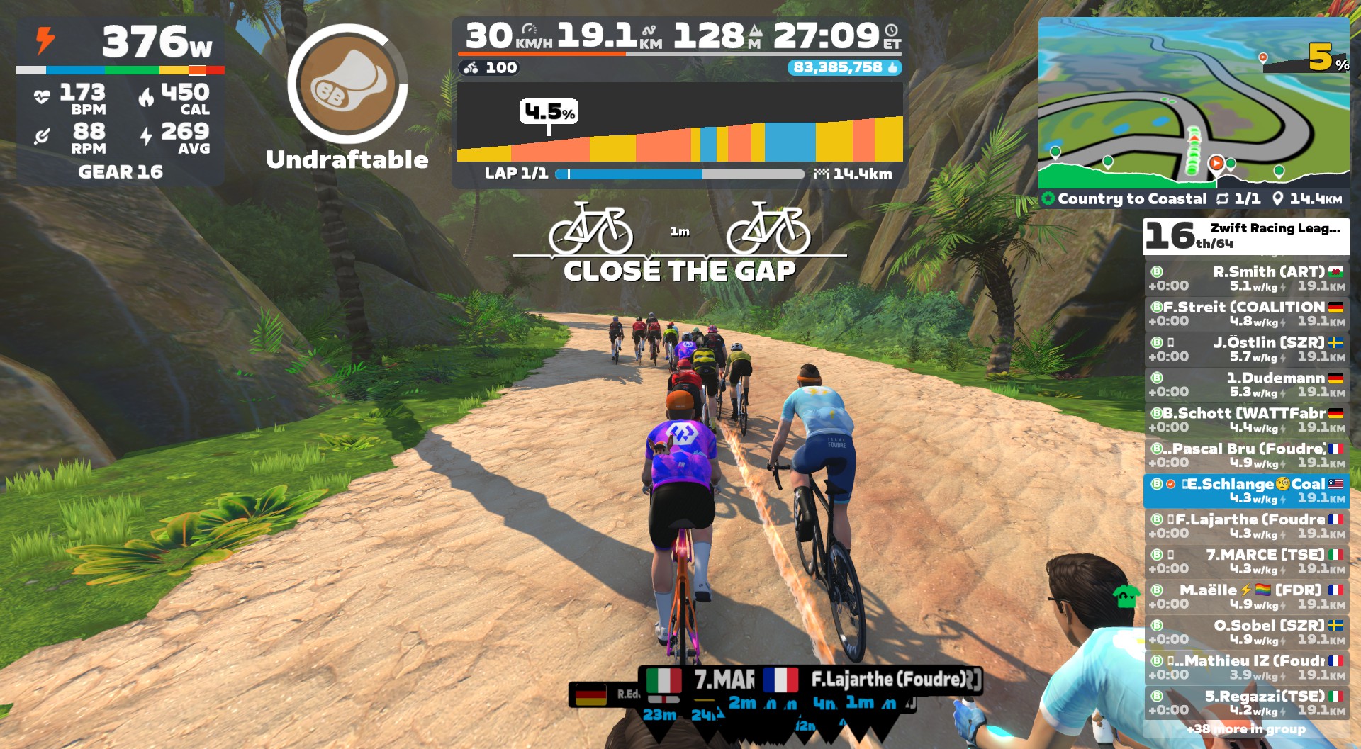- 1:27: No dice. Still no virtual shifting showing. I’m in 39th place, sitting in the back of the front pack. Pedaling like mad. Keeping silent on Discord, though, because there’s nothing my teammates can do to help. Gotta get this sorted.