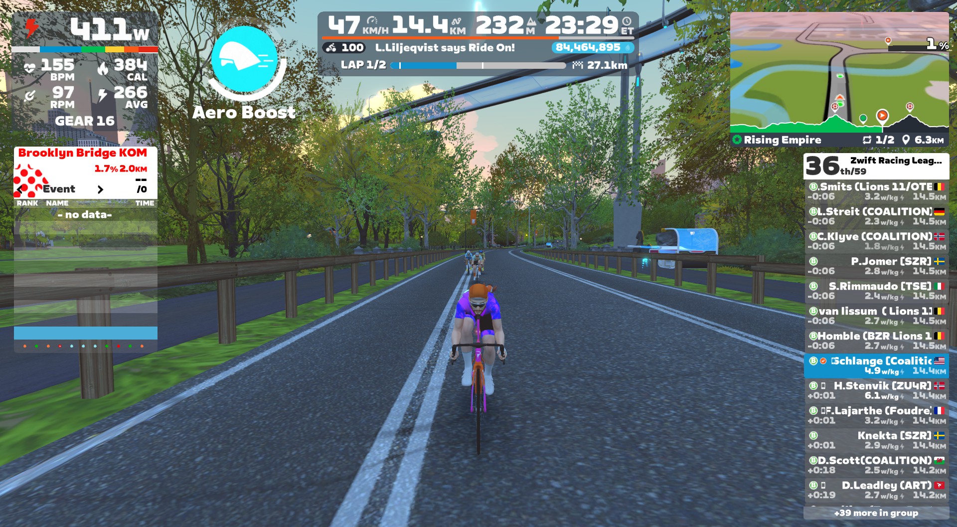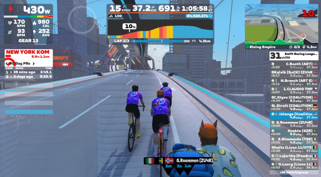 We descended to ground level and quickly hit the NY Sprint Reverse. I put in a quick dig to pip an opponent at the line (every point counts!) and earn an atta boy from Captain Neil. I also grabbed an aero powerup at the banner, which I put to good use just up the road, bridging up to Chris and Fabian’s group.
