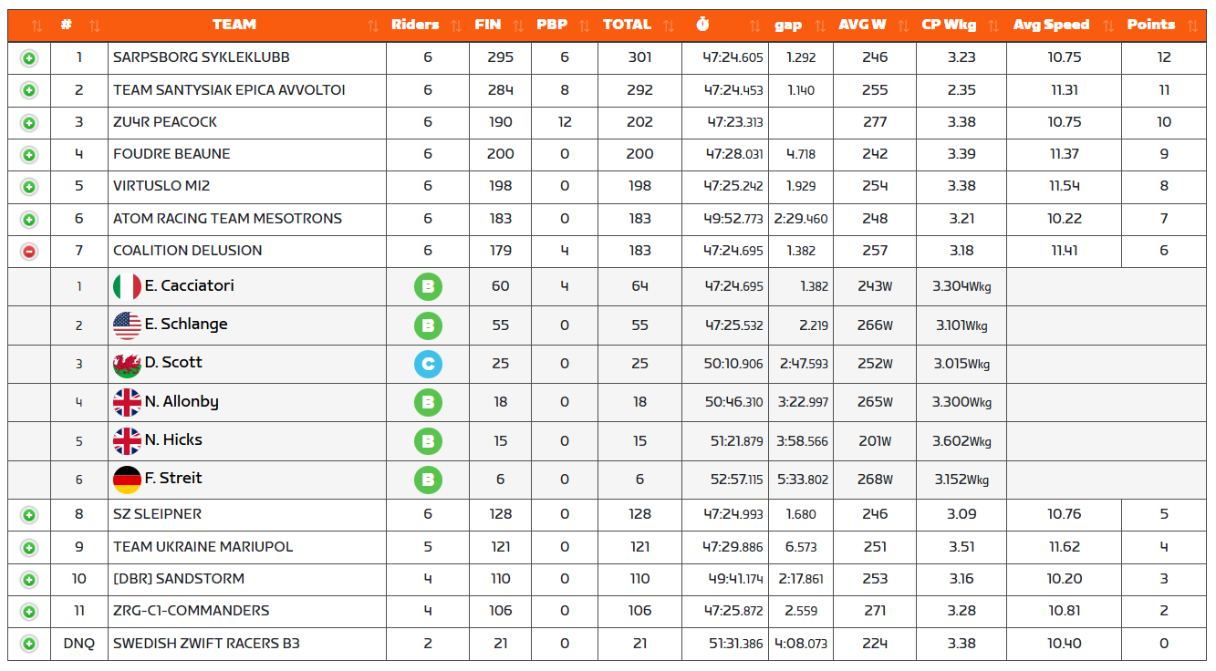 While the on-screen results showed me in 8th, ZwiftPower (and WTRL’s final results) show me in 9th.
