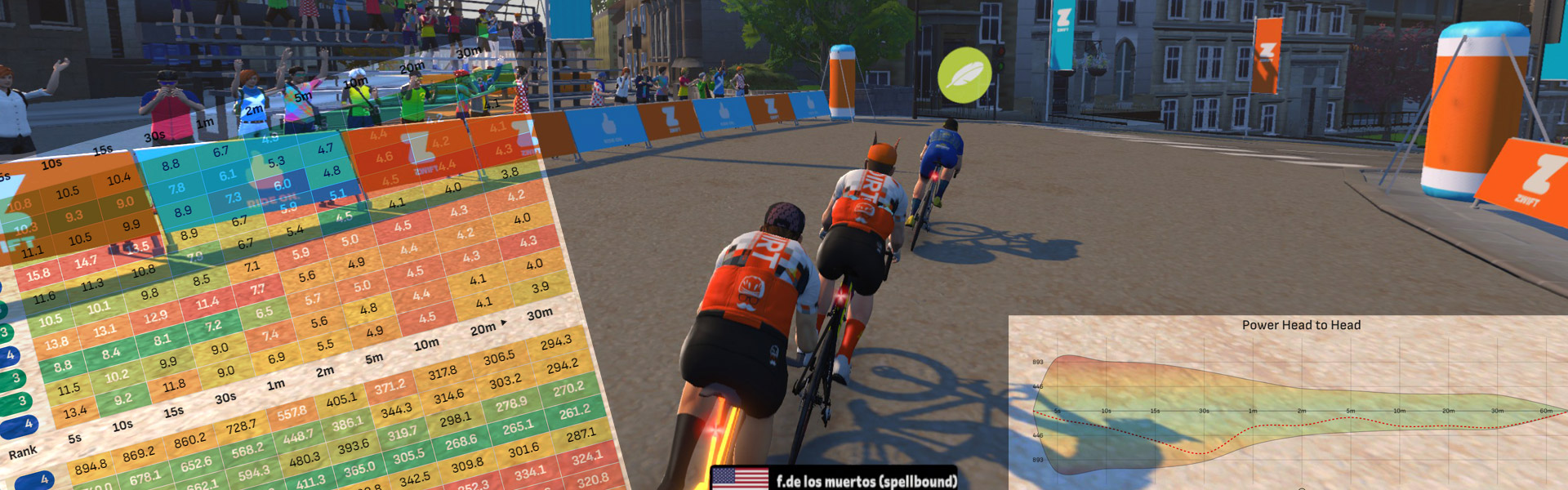 The final 500 meters were cagey indeed. Fred and I knew D. Speed had already used his aero powerup. D. Speed swerved off the front and onto our wheels, then swerved right as we turned onto the finishing straight and began sprinting.