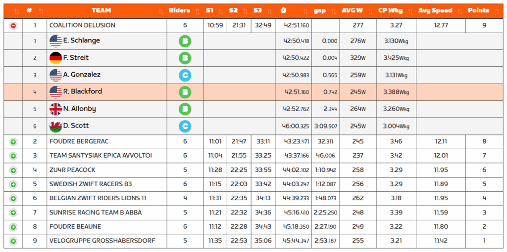 This being the first race of a new round, and only my fourth race with Coalition Delusion, I’m still getting to know my team and their strengths. Captain Neil had our pull order worked out, with a bit of help from the Zwift TTT Calculator: