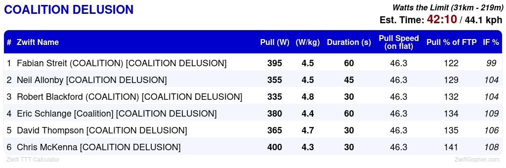 Heading into the race, my team (Coalition Delusion) was chatting about all things course and strategy as usual. Since these were fairly new roads in New York, none of us had raced them as a TTT yet. Captain Neil had our pull order worked out, with a bit of help from the Zwift TTT Calculator: