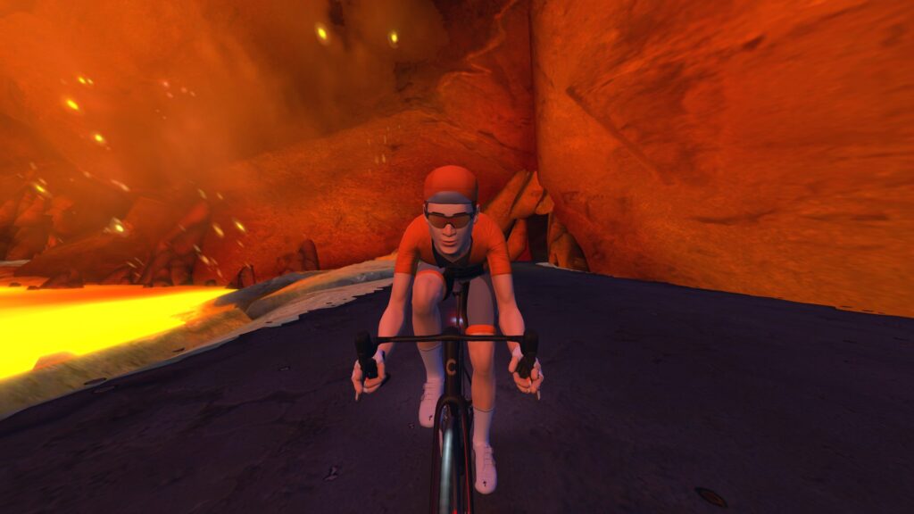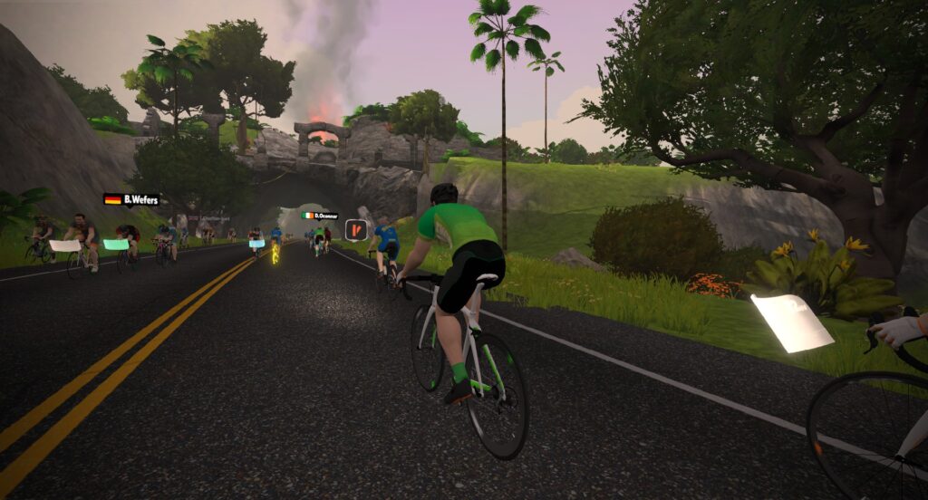 Now it’s time for our forward laps! Jarvis first, replicating “The Classic” (again, two laps), then to the Volcano for a clockwise “Volcano Circuit” lap (which requires 2.5 laps of the Volcano). Then we head to downtown for our last lap in Watopia proper: the classic Hilly Route lap, the very first route Watopia ever had!