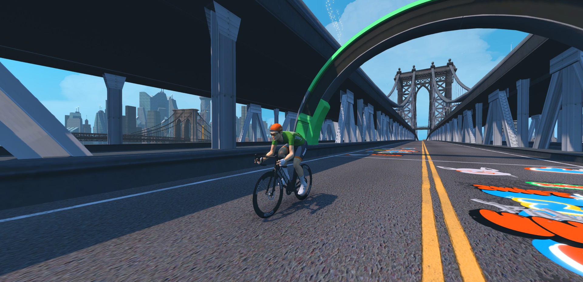 Give the 5-second Power Segment near the end of the subway a go, then climb out and head up the corkscrew road to the Manhattan Bridge. Your lead-in ends over the East River, at the green arch at the Manhattan Bridge’s midpoint. This is also your route finish line.