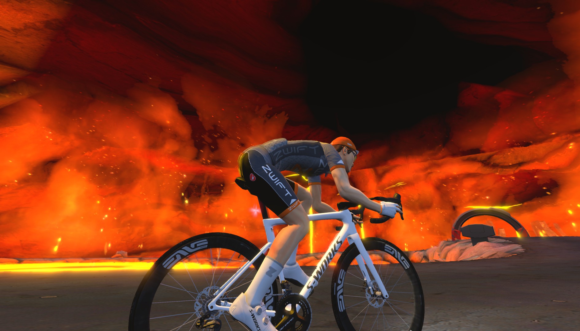 We begin in Watopia’s downtown start pens, turning right to head over to the Volcano. After crossing the glass tube bridge, you’ll turn left onto the Volcano Circuit to begin riding it in a clockwise direction.