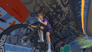 (Zwift’s Brooklyn subway is noteworthy for its gritty graffiti, but also because it was built with glass and open ceilings that let in the sunlight, allowing greenery to flourish inside. A subway-esque sort of greenway, hence the route name.)