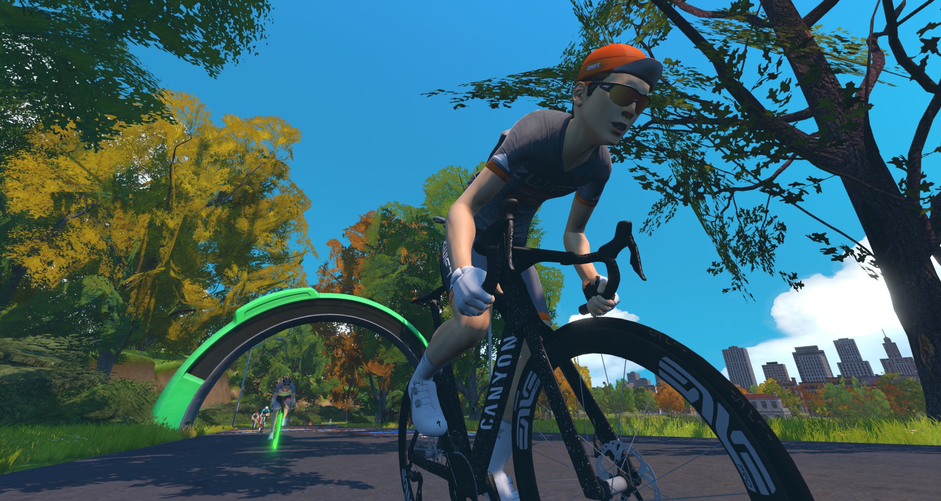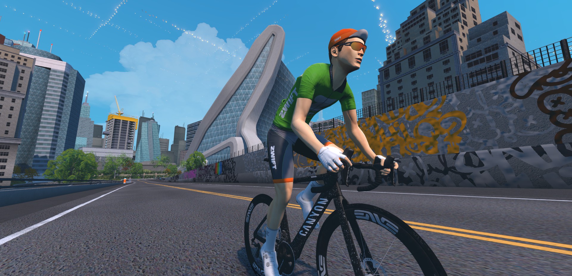 (Zwift’s Brooklyn subway is noteworthy for its gritty graffiti, but also because it was built with glass and open ceilings that let in the sunlight, allowing greenery to flourish inside. A subway-esque sort of greenway, hence the route name.)