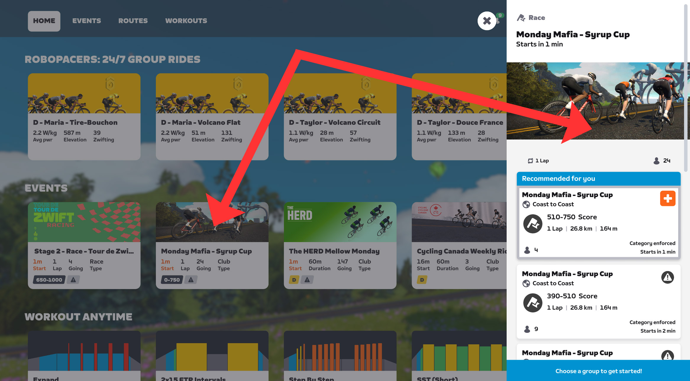Notice: the event cards don’t even say which route the event is on. That’s saved for the sidebar, which helpfully shows the route name, number of laps, total distance, and total elevation. But even the sidebar displays no route map and no route profile.