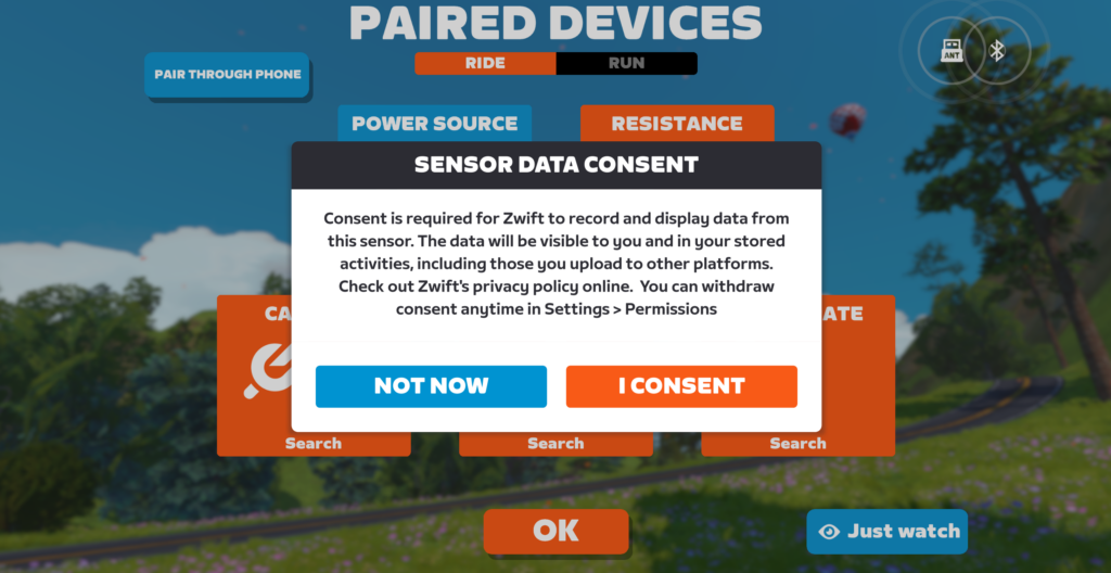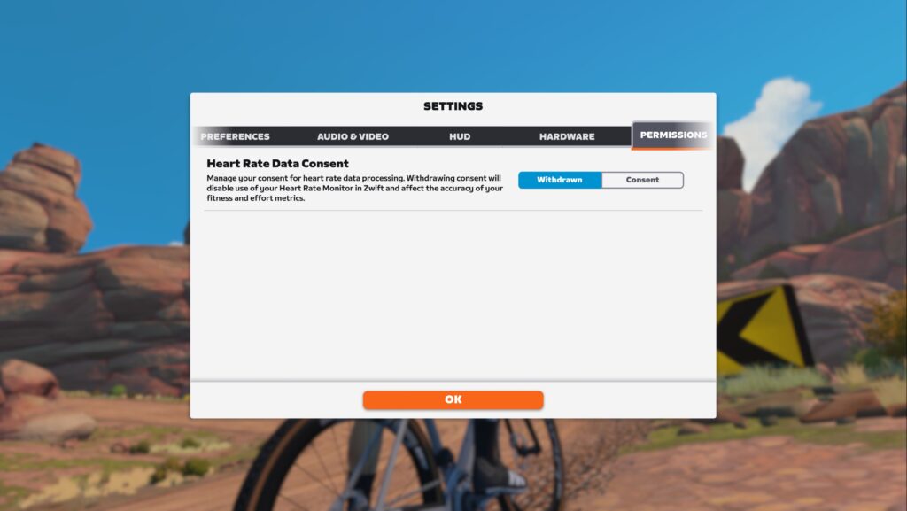 Zwift says, “Zwifters who use heart rate monitors (HRMs) will be prompted to provide one-time consent to share heart rate data with Zwift the next time they connect the HRM device. The HRM will not auto-pair until consent has been given. If consent is not provided, the HRM device will not be paired. There is no change to how Zwift uses heart rate data. Consent can be withdrawn at any time in Settings > Permissions.”