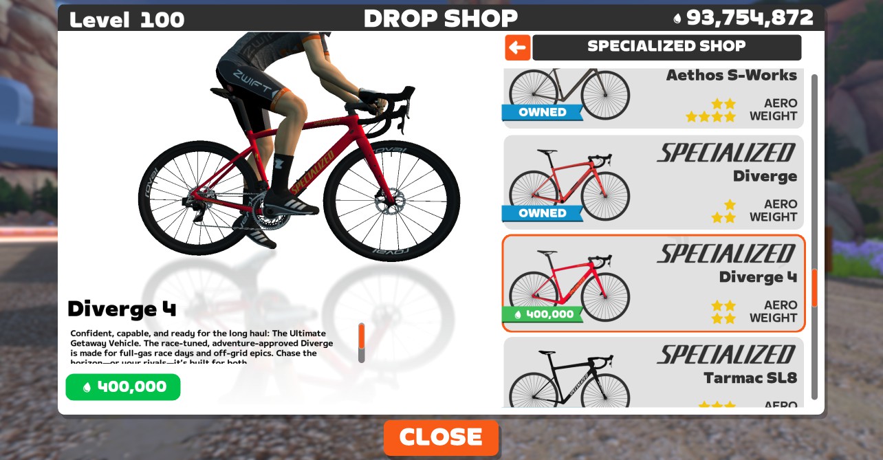 • Specialized Diverge 4: level 12+, 400,000 Drops, 2 stars aero, 2 stars weight