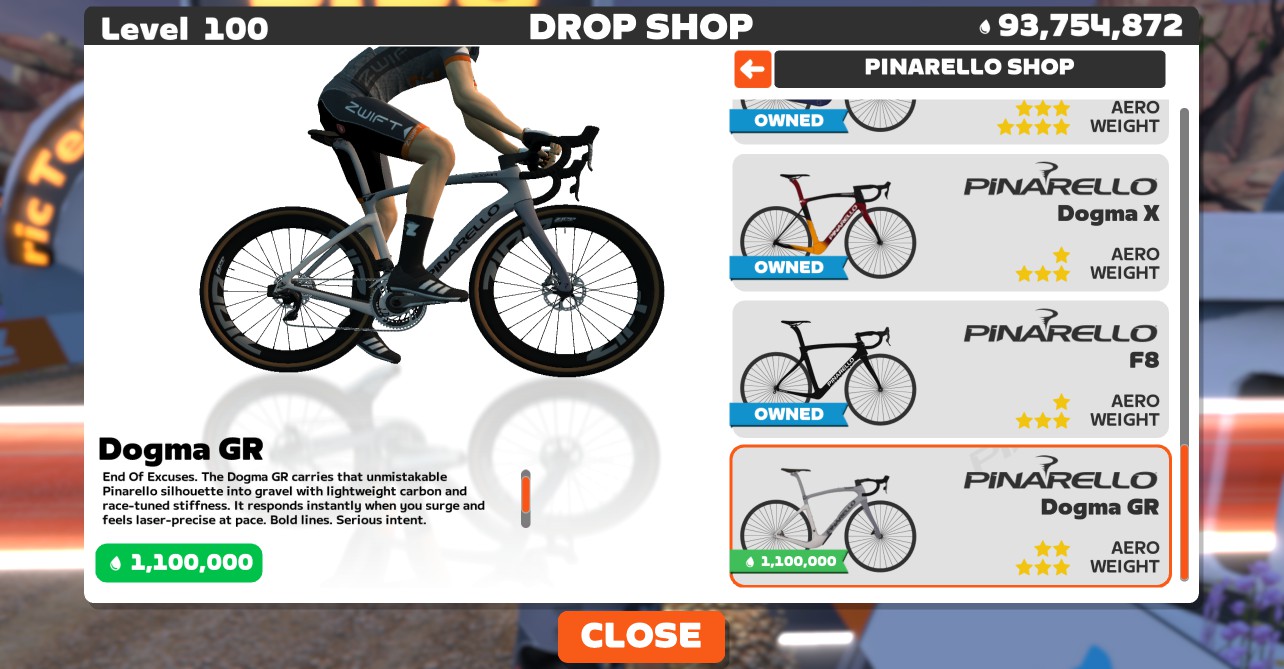 • Pinarello Dogma GR: level 30+, 1,100,100 Drops, 2 stars aero, 3 stars weight
