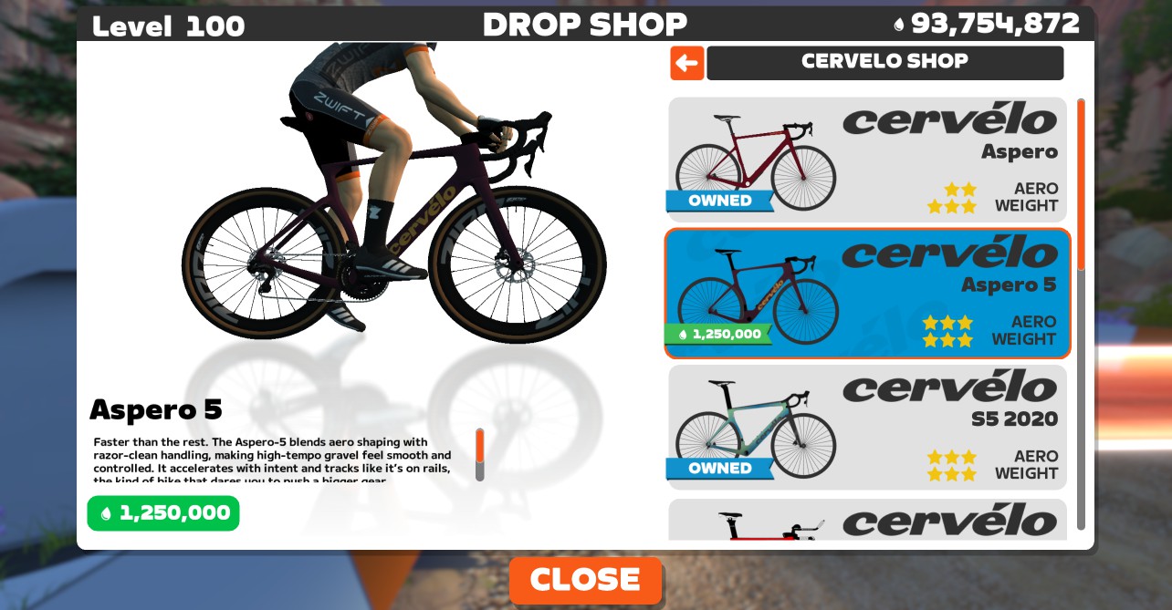 • Cervelo Aspero 5: level 35+, 1,250,000 Drops, 3 stars aero, 3 stars weight (the first 3-star aero gravel frame on Zwift!)