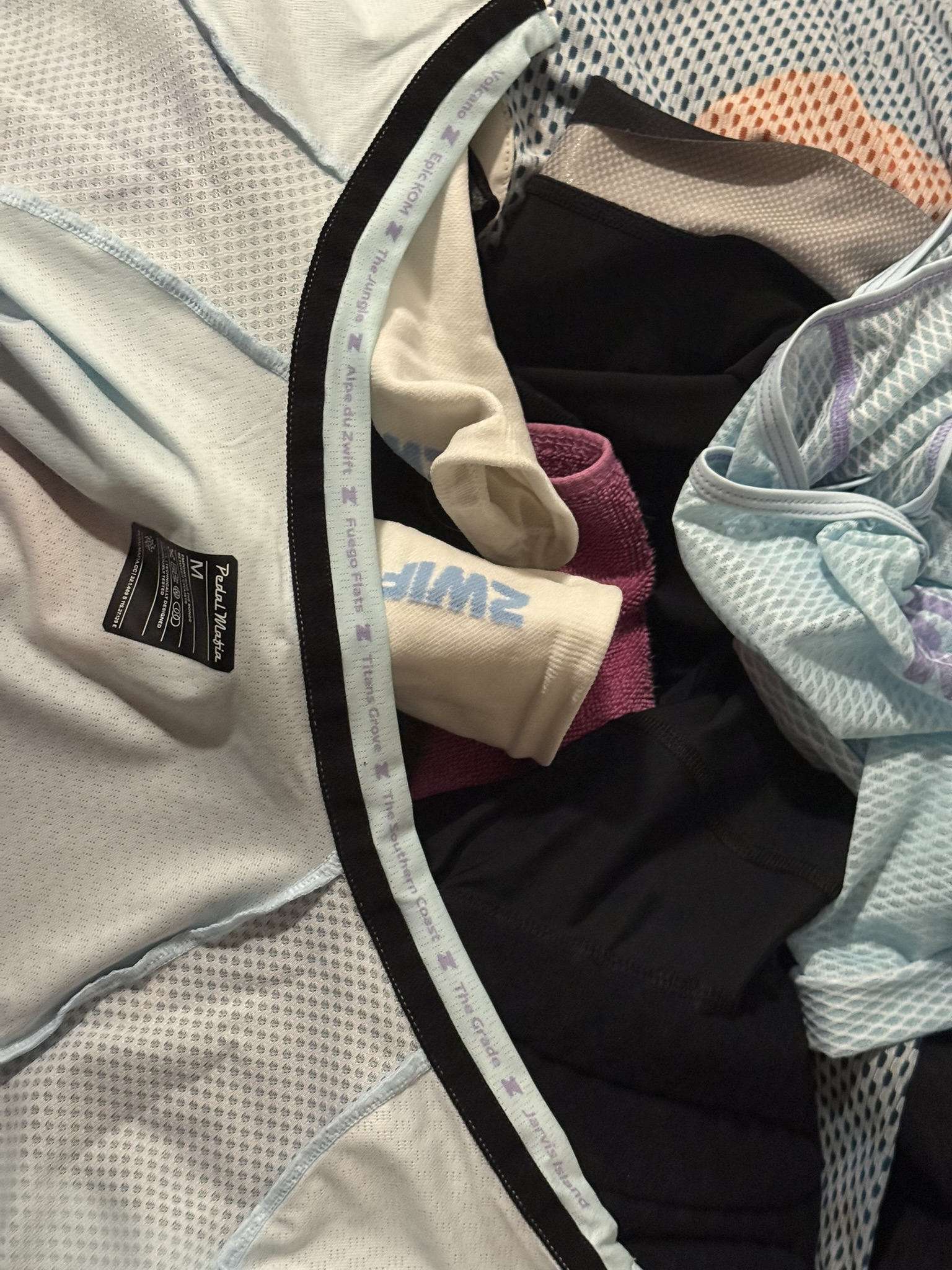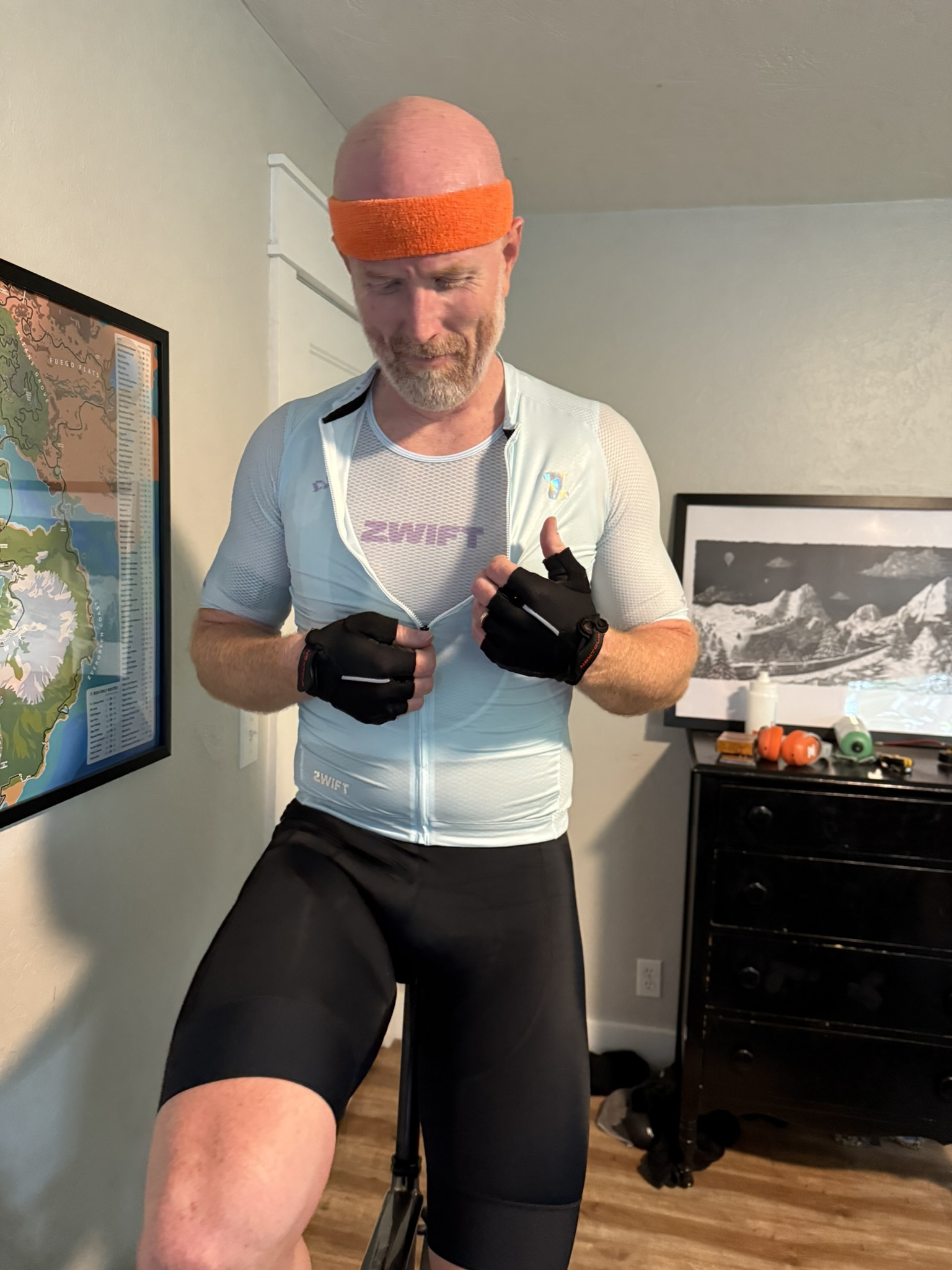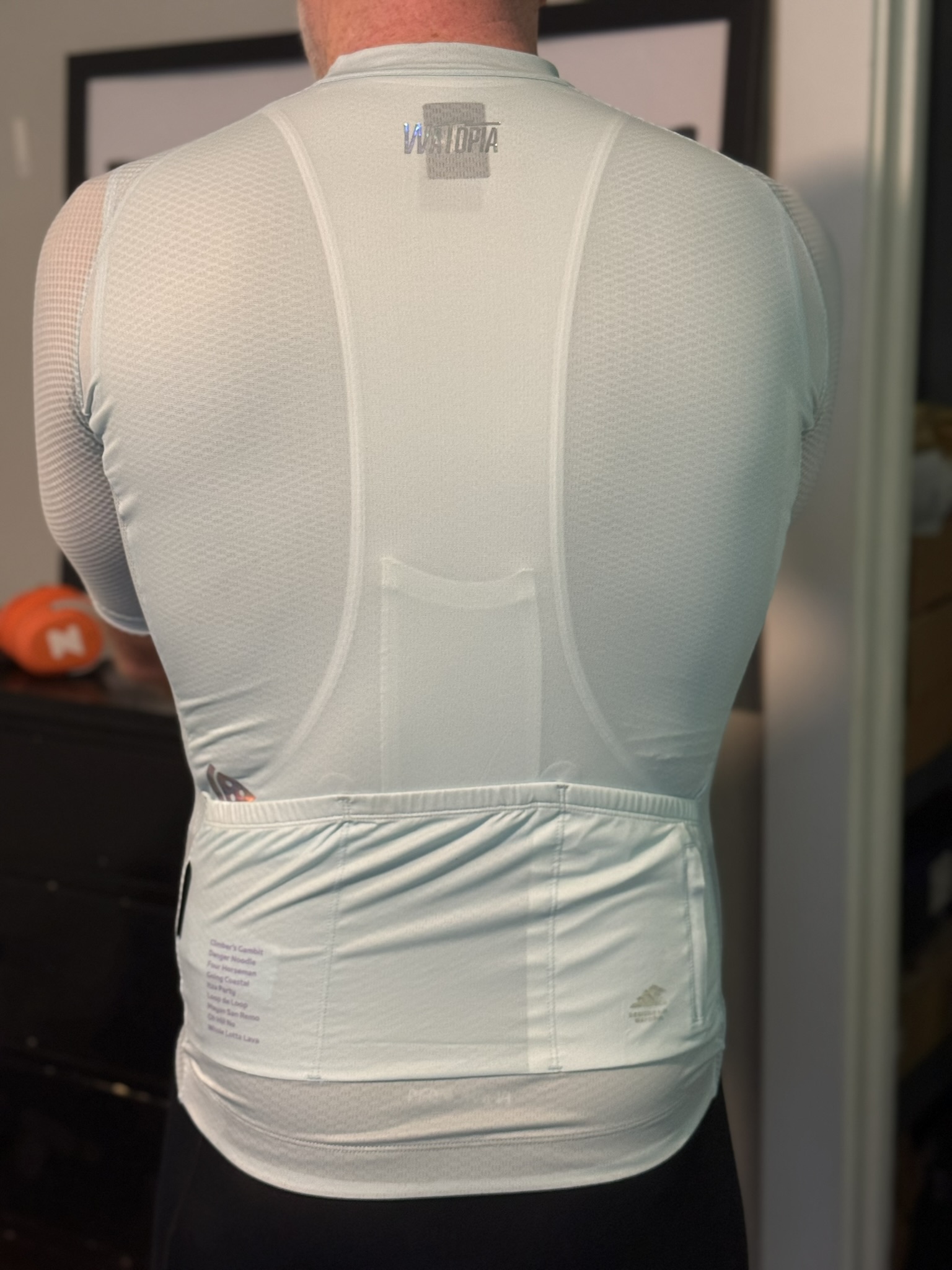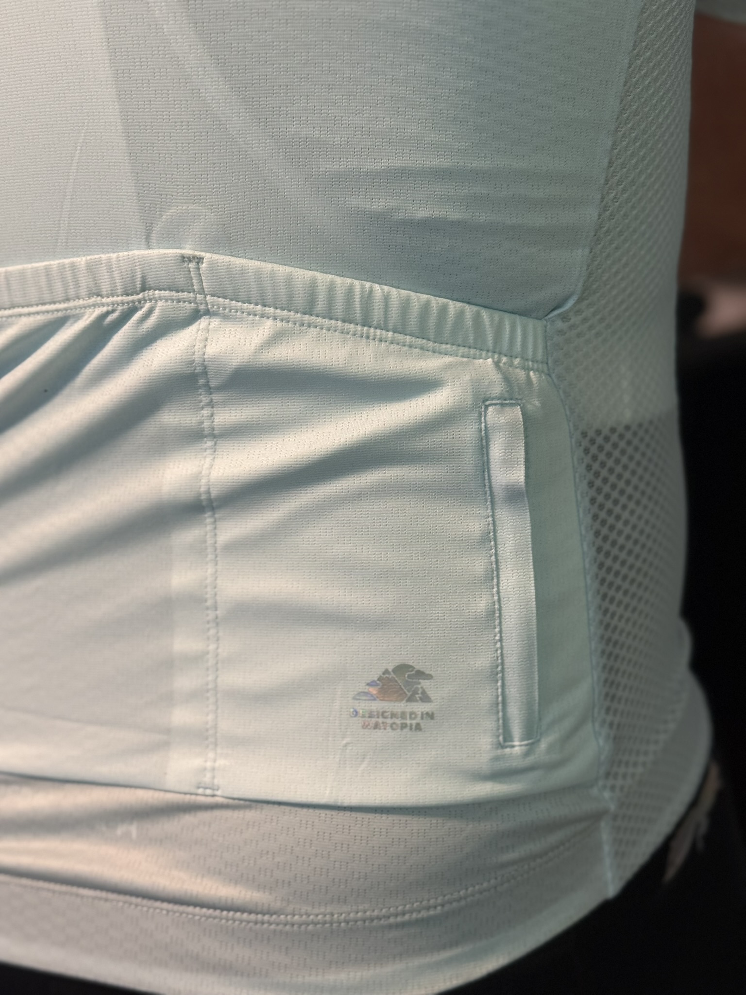 A note regarding color: I chose the “frost” color, and what you see in the pictures below is, to my eyes, a fairly accurate presentation of the actual color of the jersey. What I see on Zwift’s website for this color looks significantly bluer than it really is.