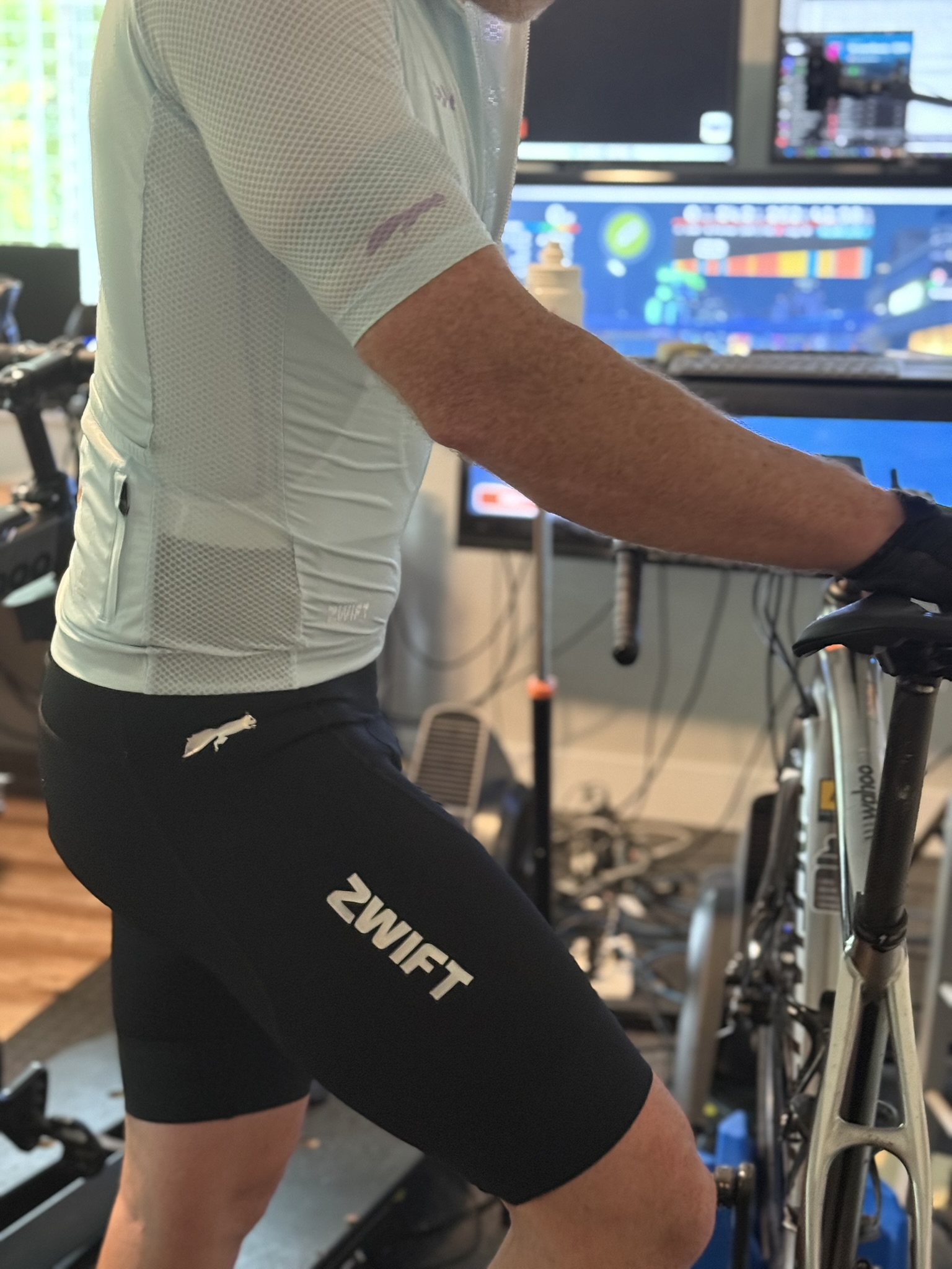 While this isn’t an indoor-specific jersey, it is a very breathable top that works well outdoors in summer heat as well as indoors on the trainer. I’ve complained to ZHQ in the past that the kits they’ve sold aren’t indoor-friendly, particularly their previous Expression Jersey, which is one of the least breathable jerseys I own. So it’s nice to see Zwift selling a top that works well indoors. The arms and side panels use a 3D mesh material that keeps you dry and cool without being so fragile that it breaks down in the wash, while the front and back use a denser but still lightweight perforated fabric that provides more coverage but still wicks sweat and allows airflow for drying.