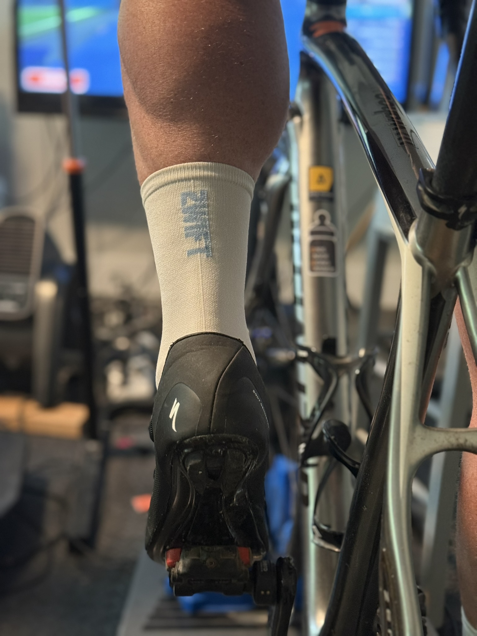 Keeping with the theme, Watopia Essentials socks are from Pedal Mafia’s Core collection. I got the Small/Medium size because I’ve found Pedal Mafia’s socks run quite tall. And I went with the “frost” color to match the top.