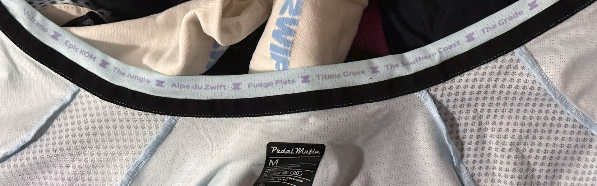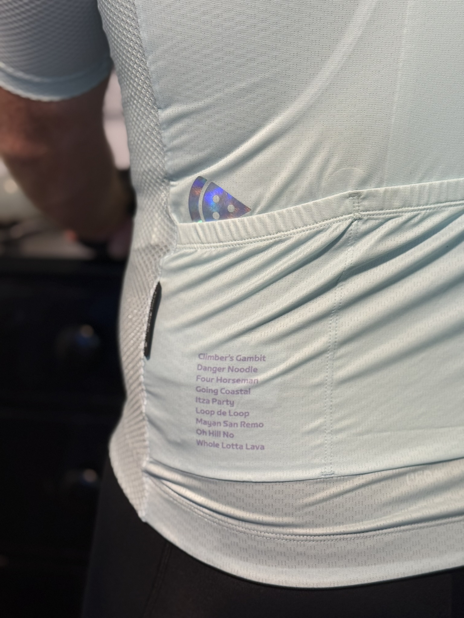Even though the design is far from flashy, there are lots of small finishing touches on this jersey. These include a PM-branded waist gripper, a tag with spaces to write your emergency details, a zippered side pocket, and a pizza slice in the back-left pocket. The inside of the collar (shown above) even lists all the Watopia expansions, in chronological order. A super-nerdy Zwifty touch! (And while I’m being nerdy, the back-left pocket includes “Four Horseman” in the list of routes… but it should be “Four Horsemen“.)