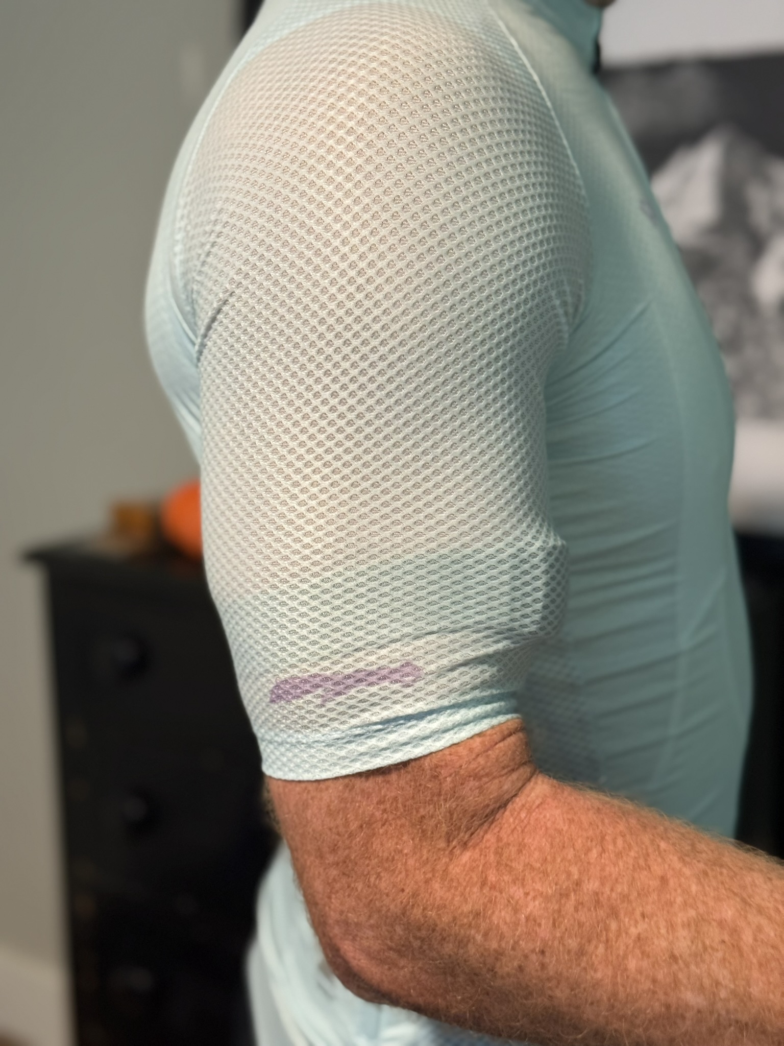The entire base layer is made of the same 3D mesh, which is an even lighter/more open mesh than the arms and sides of the jersey. It’s about as breathable a fabric as you’ll find, if you want something that also wicks sweat (and you do).