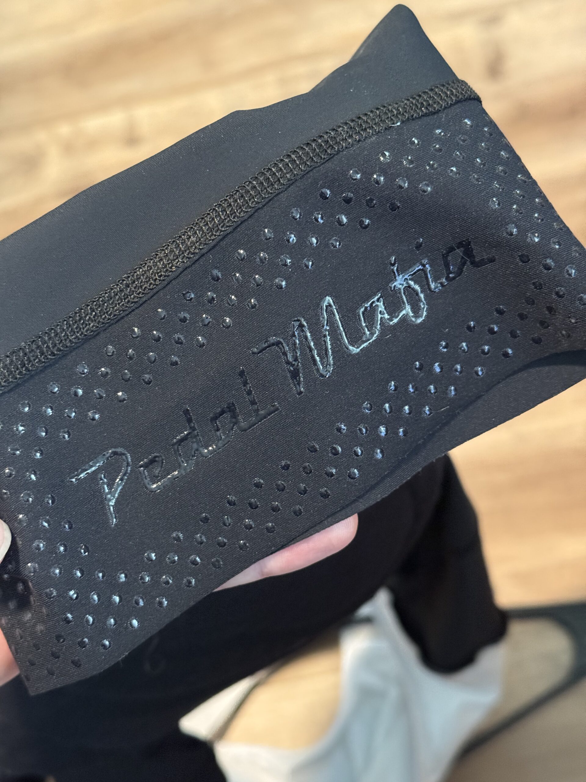If you look closely, you’ll see some nice finishing touches on these bibs. The metallic logos are fun, but you’ve also got a little pocket on the back brace to hold a gel or even your phone, Pedal Mafia-branded extra-wide leg grippers, a logo on the chamois, plus the feel-good factor of 75% recycled lycra composition… these aren’t just basic bibs.