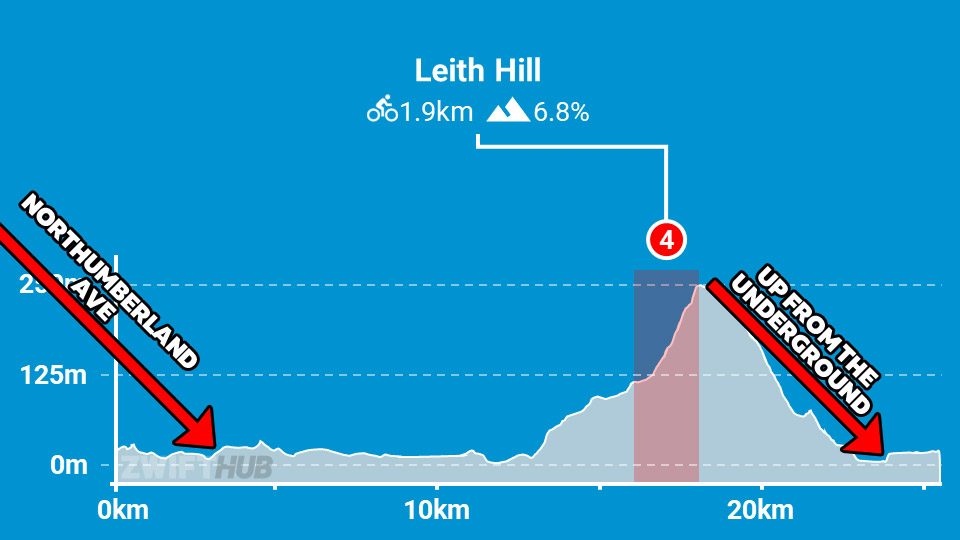 The first, Northumberland Avenue, comes early on as you turn right from the Thames and head up to Trafalgar Square. This is the first climb more than a few seconds long on the route, so expect the effort level to lift significantly for ~30 seconds, even though riders will be saving their big attack for Leith Hill up the road.