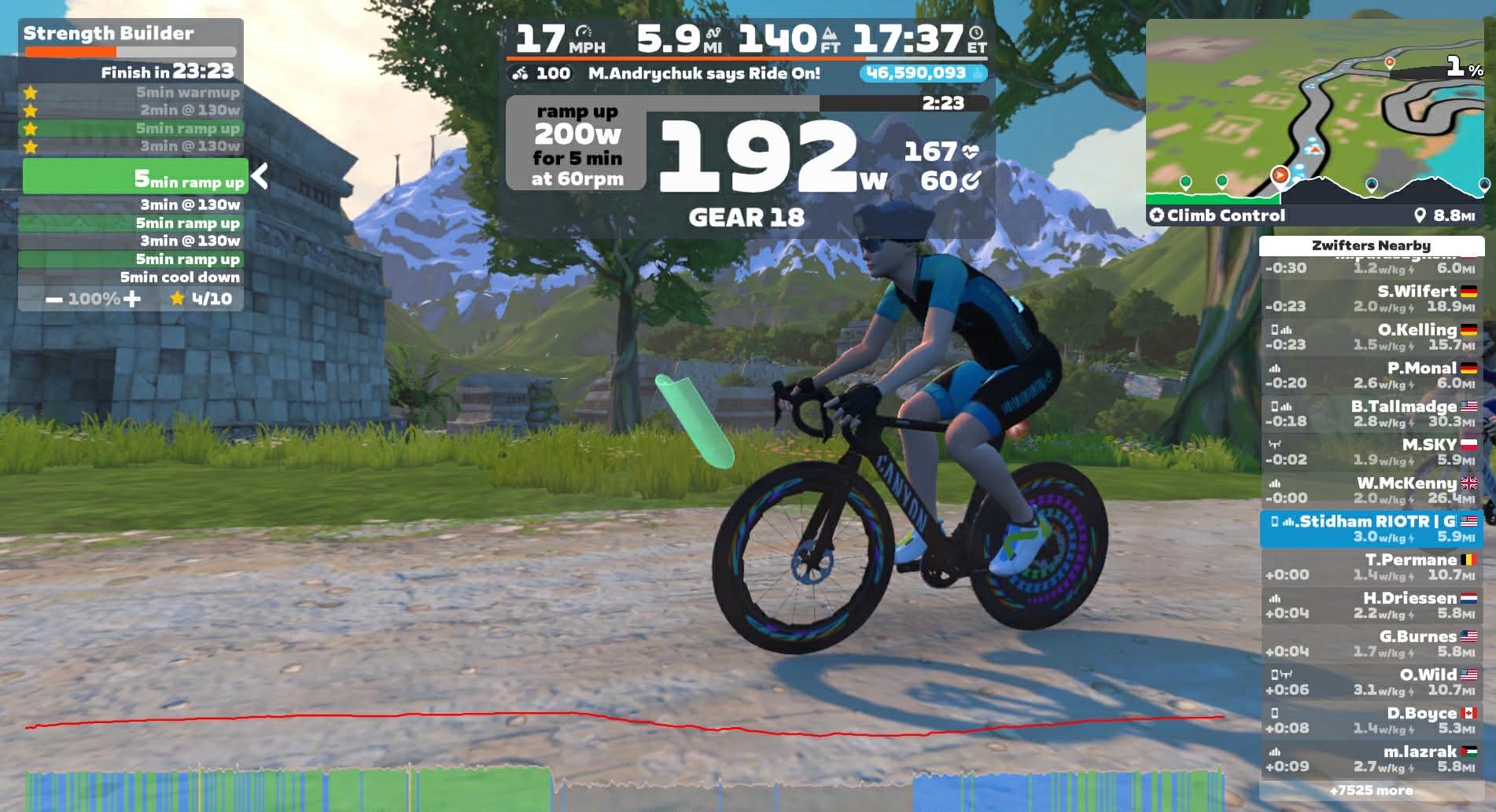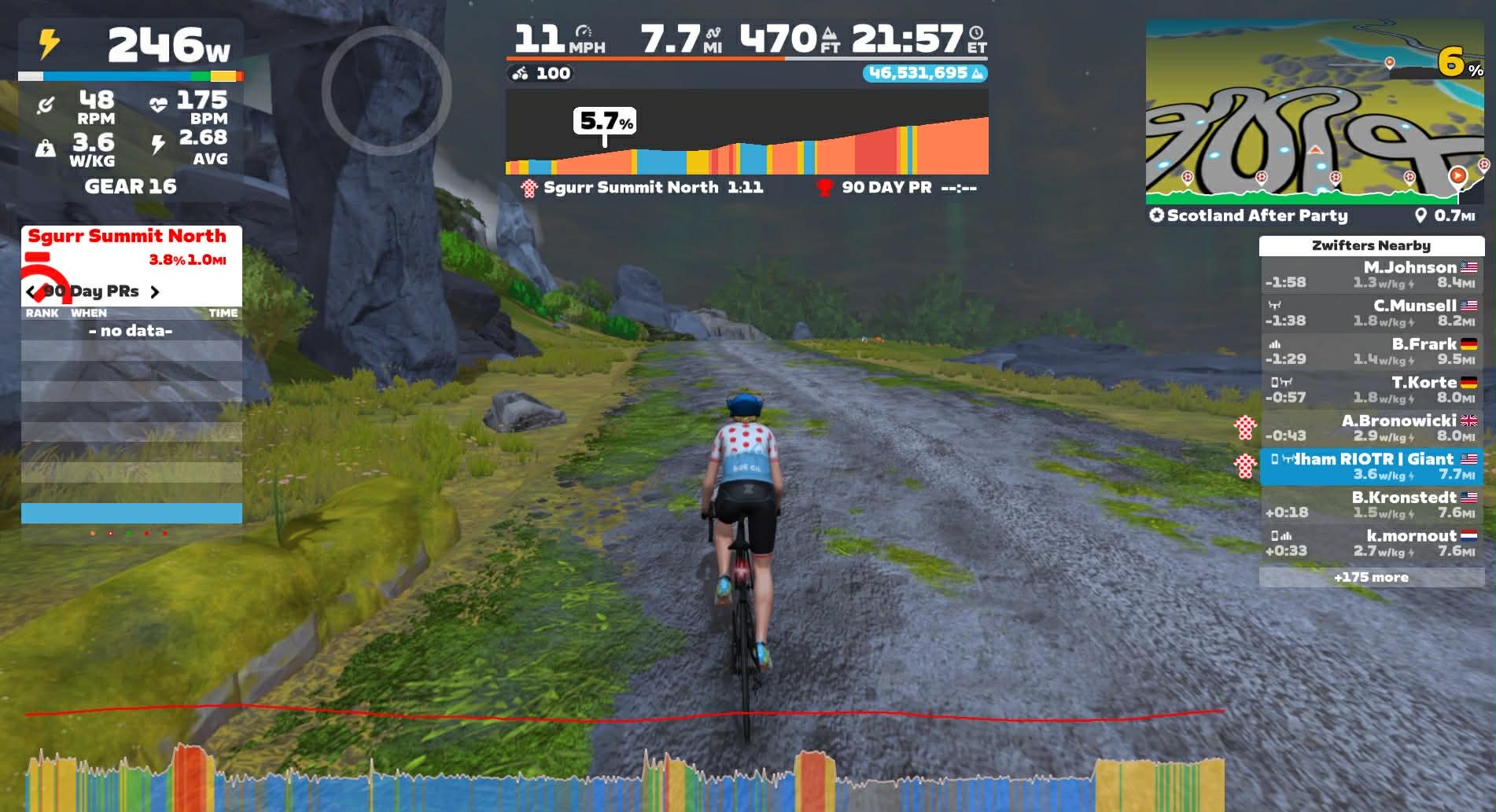 - Reintroducing efforts: like a 30-minute ride averaging 2.7 w/kg, which felt like a breakthrough. I chose Scotland After Party for this as it allowed me to do efforts.
