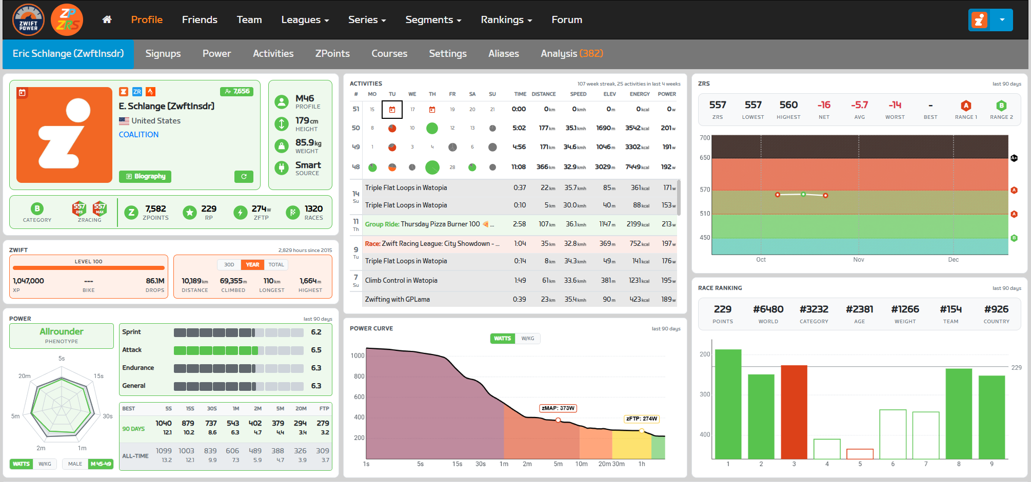 - Left Column: Athlete profile, Zwift stats, and power analysis