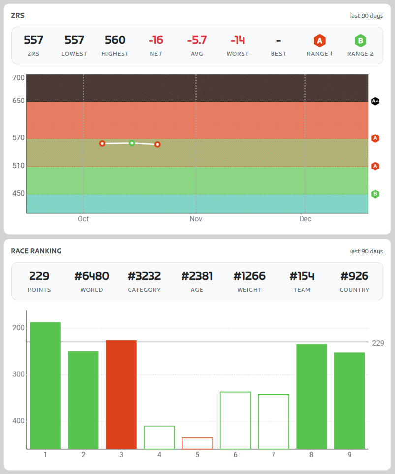 - ZRS: Current racing score (dual badge showing both current and MAX30 score for personal profiles)